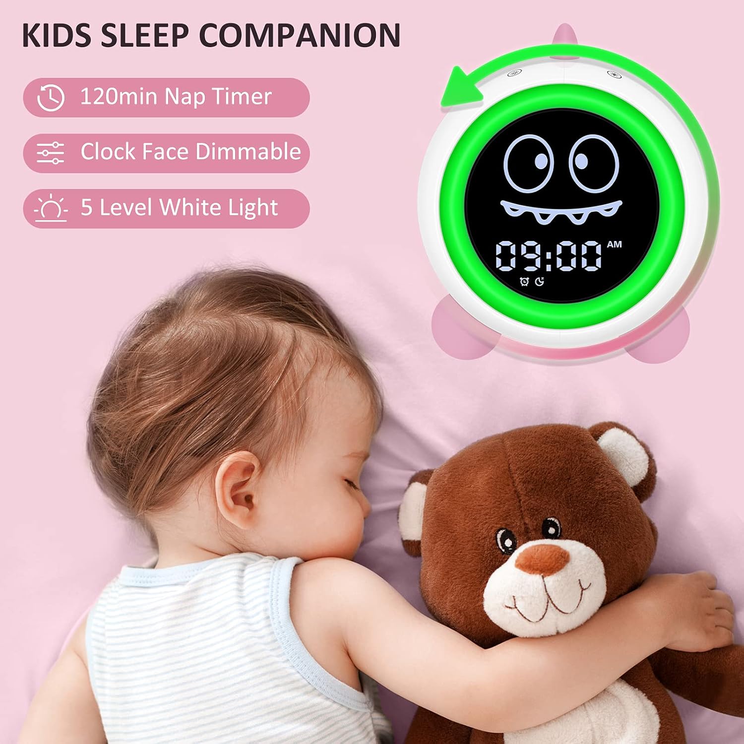 Kids Alarm Clock, Toddler Sleep Training Clock with Night Lights, Sound Machine, Time to Wake Dinosaur Alarm Clock for Children, Gift Ideas for Kids Toddler Boy Girl (Pink)