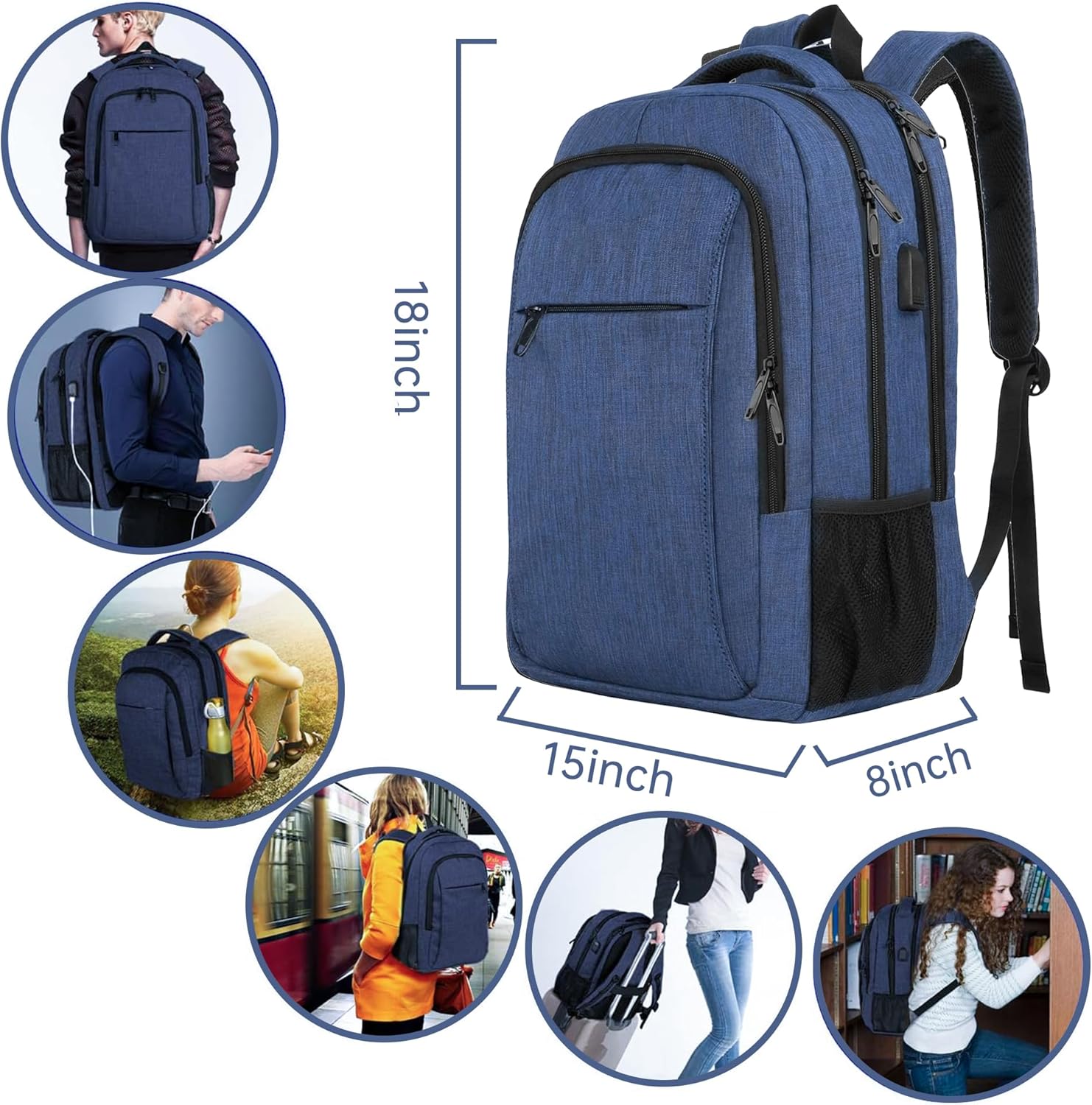 MANY POCKETS & MULTI COMPARTMENT:The dimensions of this Travel Backpack are 18x15x8 inches ,Pocket more than 15, the main compartment of our travel backpack can hold 18inch laptop, binders folders, clothes and college items. Front compartment with pockets for mobile phone and keychain etc. Make accessories organized and easy to find. Special laptop rucksacks for commuter men women