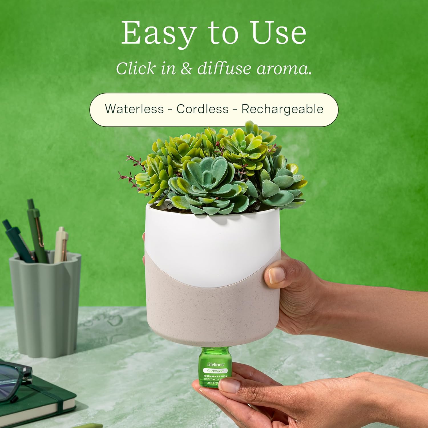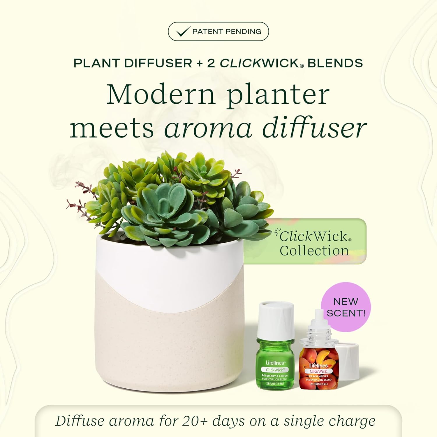 Lifelines Plant Diffuser Bundle with 2 Clickwick Essential Oil Blends – Rechargeable Aromatherapy Diffuser, Artificial Faux Plants Home & Office – Modern Planter, Succulent