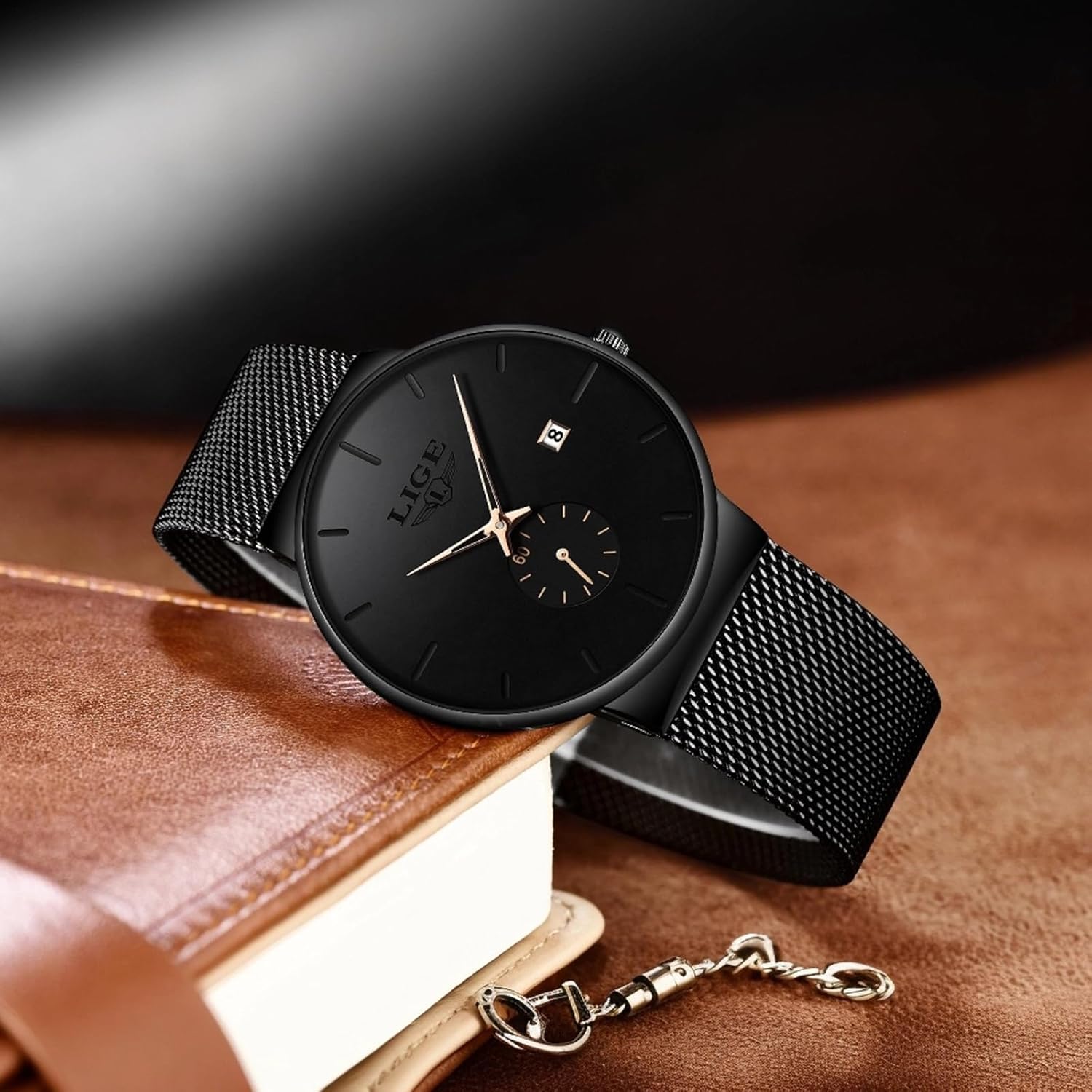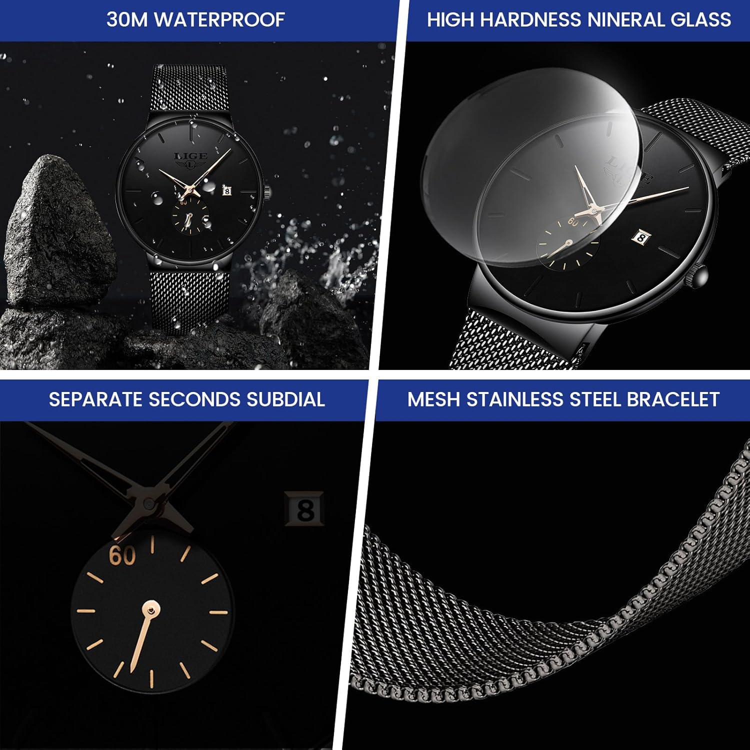 LIGE Wrist Watches for Men Waterproof Dress Vintage Work Casual Stainless Steel 3ATM Water Resistant Japanese Quartz Movement Date Display Business Retro Minimalist Thin Mens Analog Watch