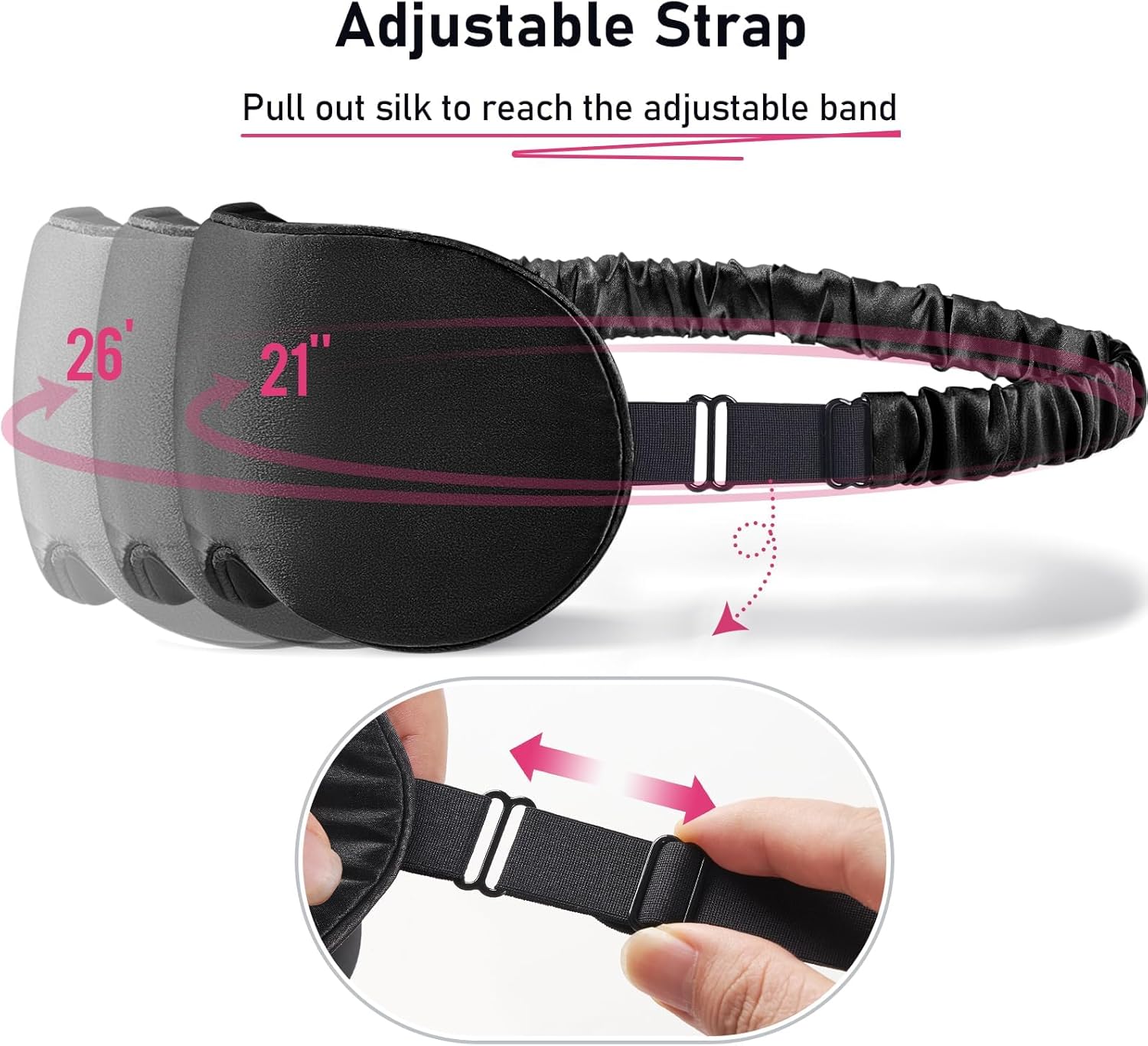 Adjustable Strap: Our elastic buckle strap covered with 100% Mulberry silk on both sides, making it so comfy on your head, and doesn’t tangle/stick your hair unlike other masks can be easily adjusted from 21 inches to 26 inches to fit all different head sizes—men, women, and kids