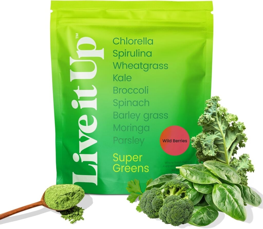 Live It Up Super Greens Powder | All-Natural Plant-Based Superfood Blend w Probiotics, Digestive Enzymes | Supports Gut Health, Immunity, Energy, &…