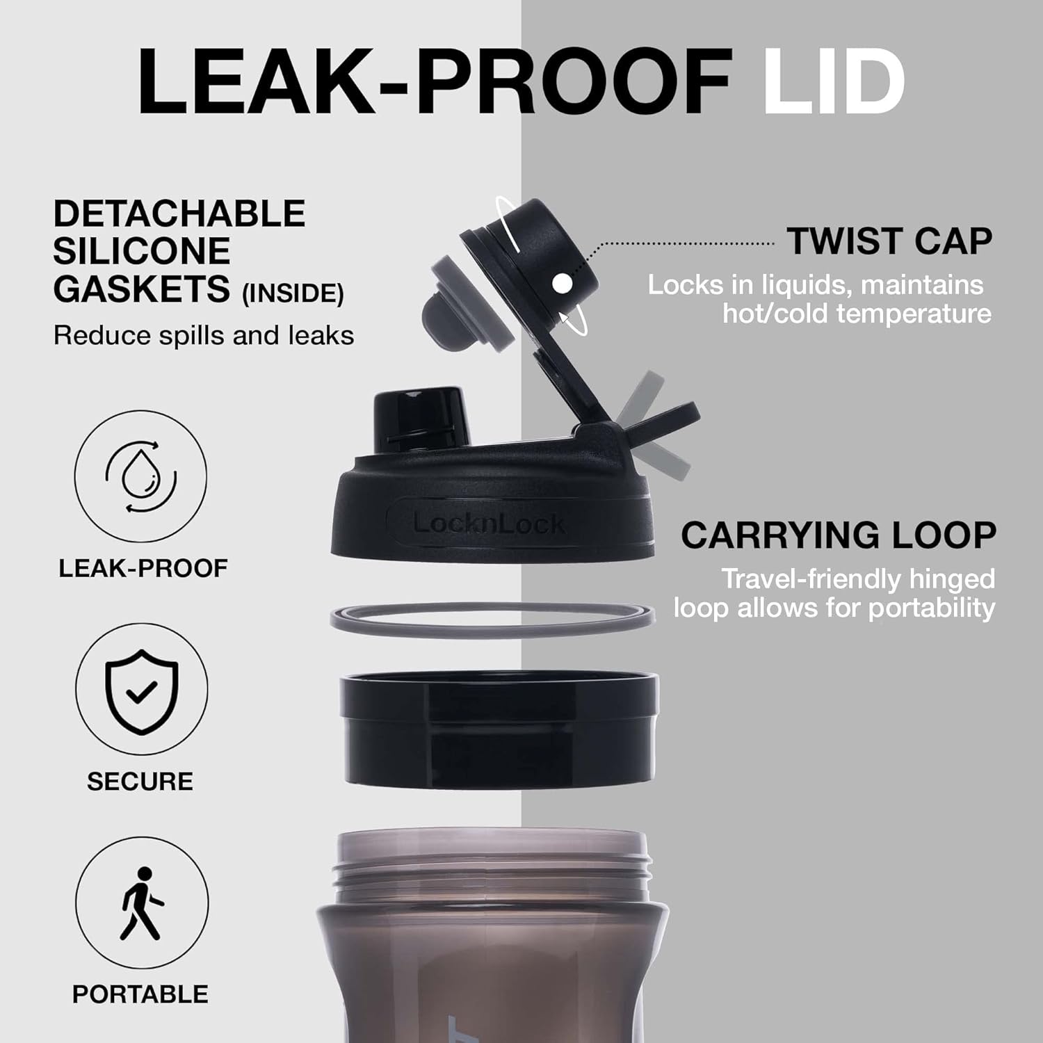 Twist cap’s and lid’s silicone gaskets prevent leaks and spills. Carrying loop allows portability. Detachable parts for hygienic practice.