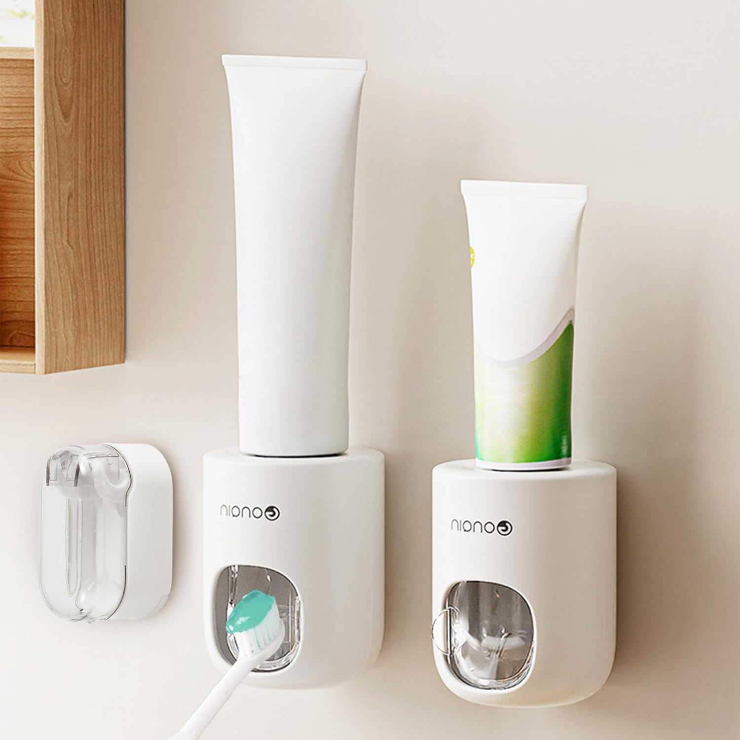 Package Includes:2 toothbrush head holders with auto-flip caps + 1 automatic toothpaste dispenser. Squeezes exact amount, eliminates mess/waste, and offers ultimate bathroom convenience