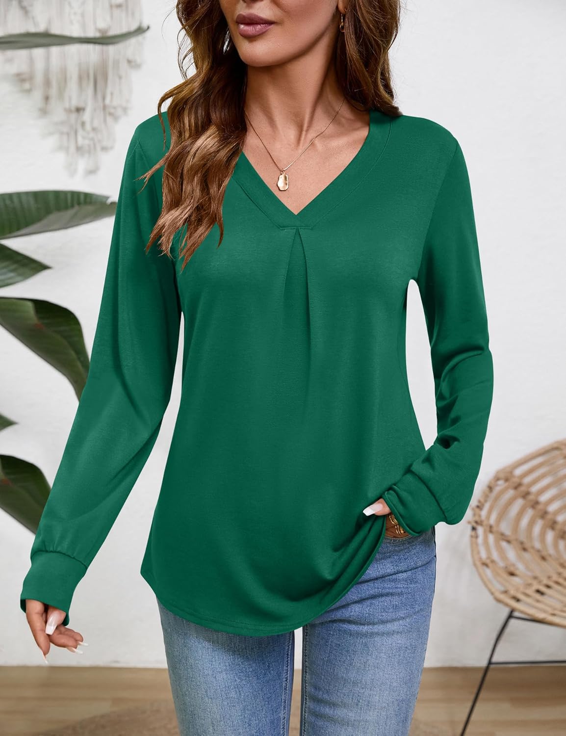 LUYYA Women’s Long Sleeve Pleated V Neck Blouse Business Casual Tunic Top Loose Fit Work Shirt 2025