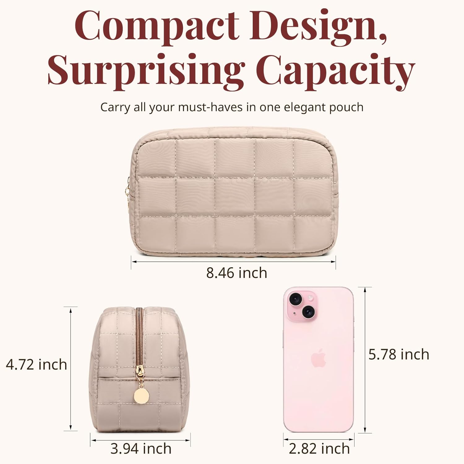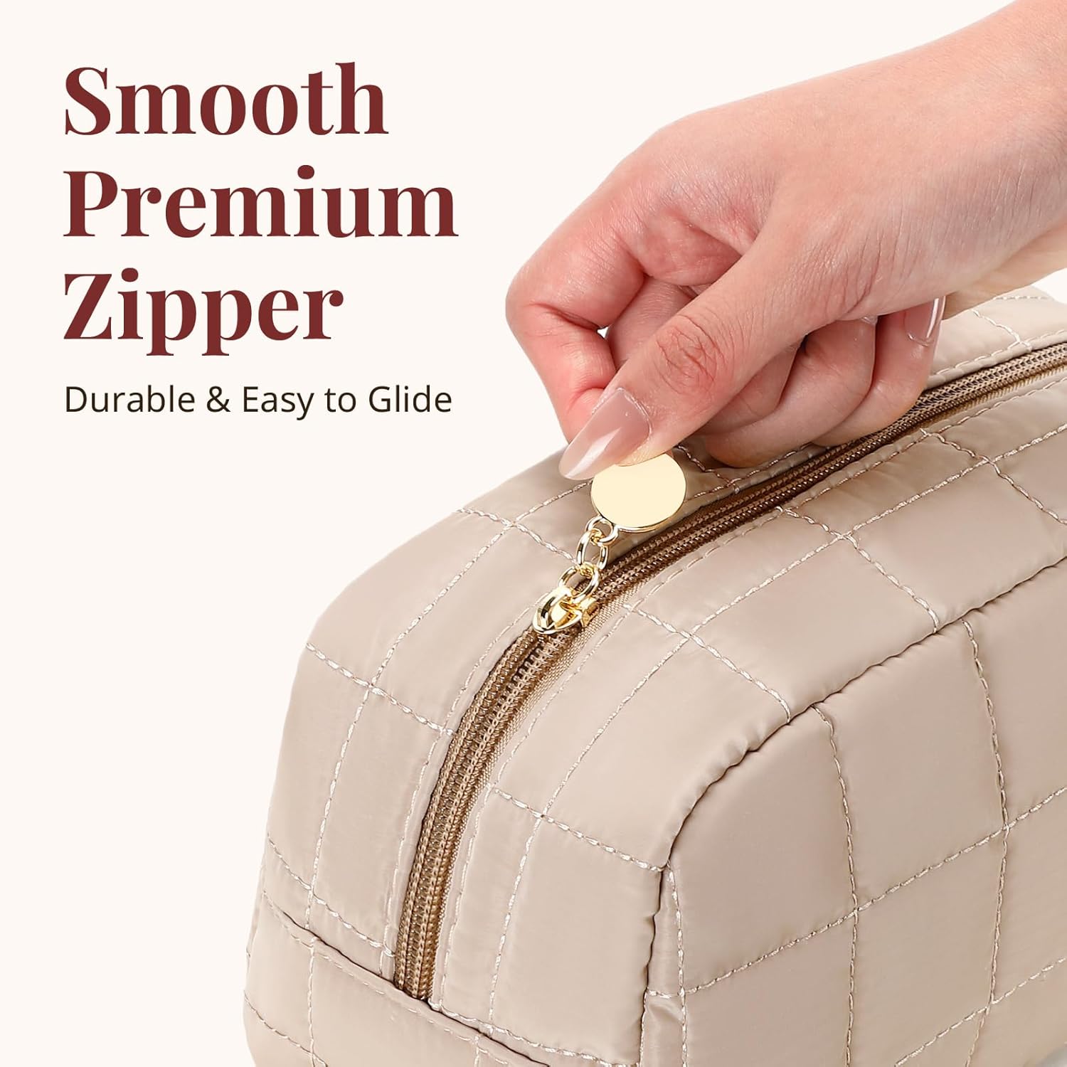 Durable & Easy-to-Clean Interior: Crafted from quilted fabric with a wipeable lining, this cosmetic bag keeps your products protected from spills or stains. Perfect for daily use or travel, it functions as a reliable makeup travel bag that stays fresh and organized anytime.