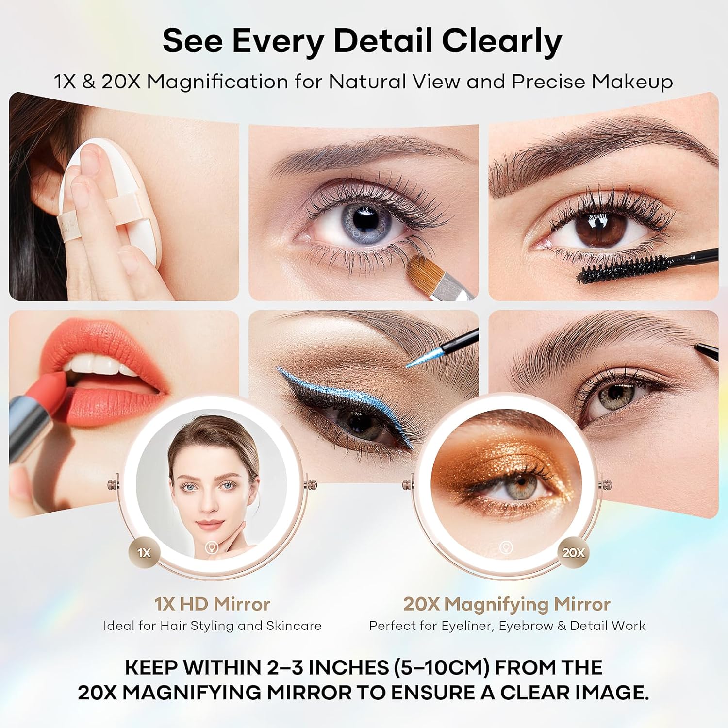 Makeup Mirror with Lights, 5000 mAh Rechargeable Double Sided Magnifying Vanity Mirror with 3 Colors, 1x/20x, 360° Rotation , Brightness Adjustable Magnification Lighted Makeup Mirror, Women Gift