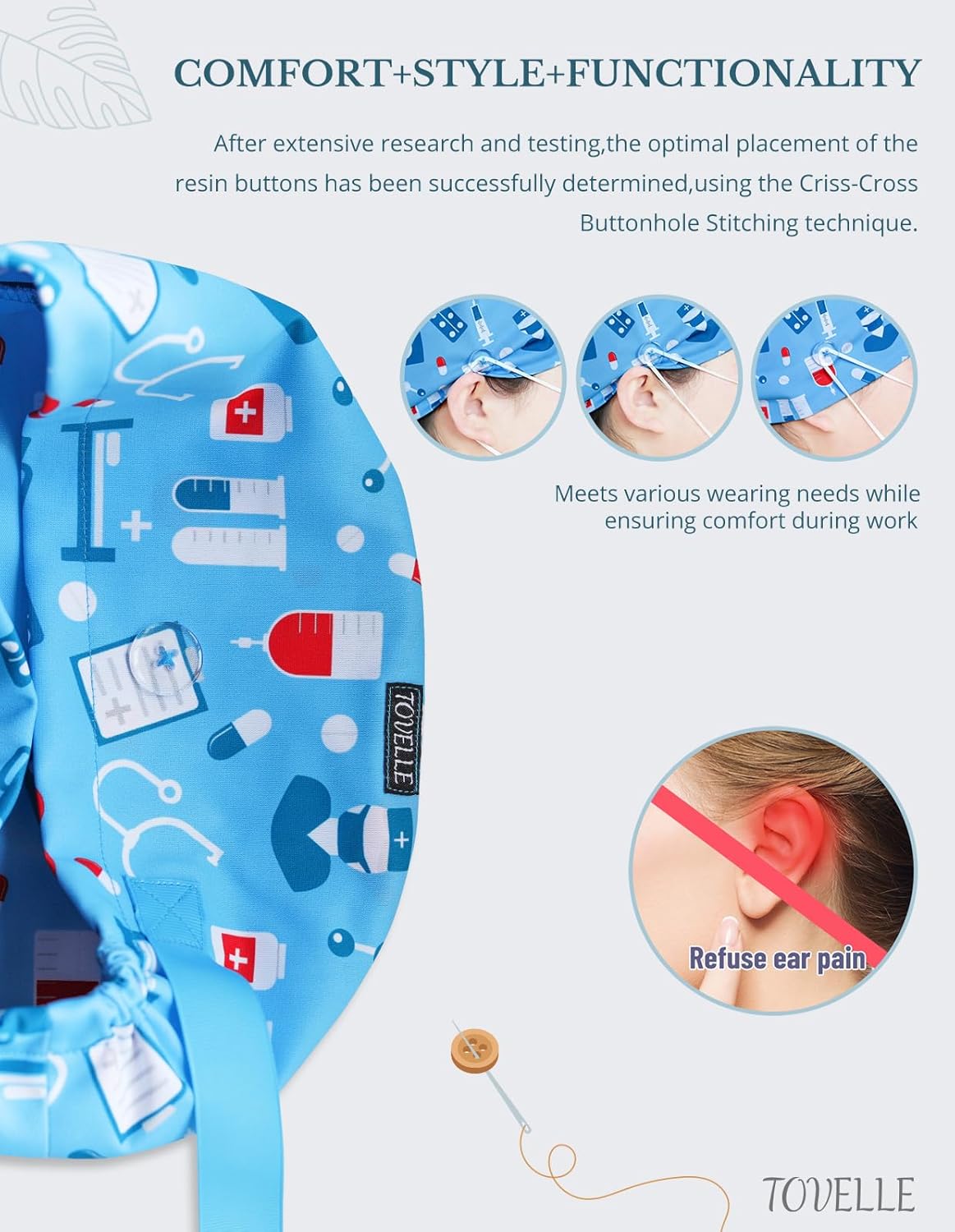 Medical Pattern Scrub Caps for Women and Men with Buttons, Surgical Tech Head Cover, Adjustable Euro Style Scrub Hat for Long or Short Hair