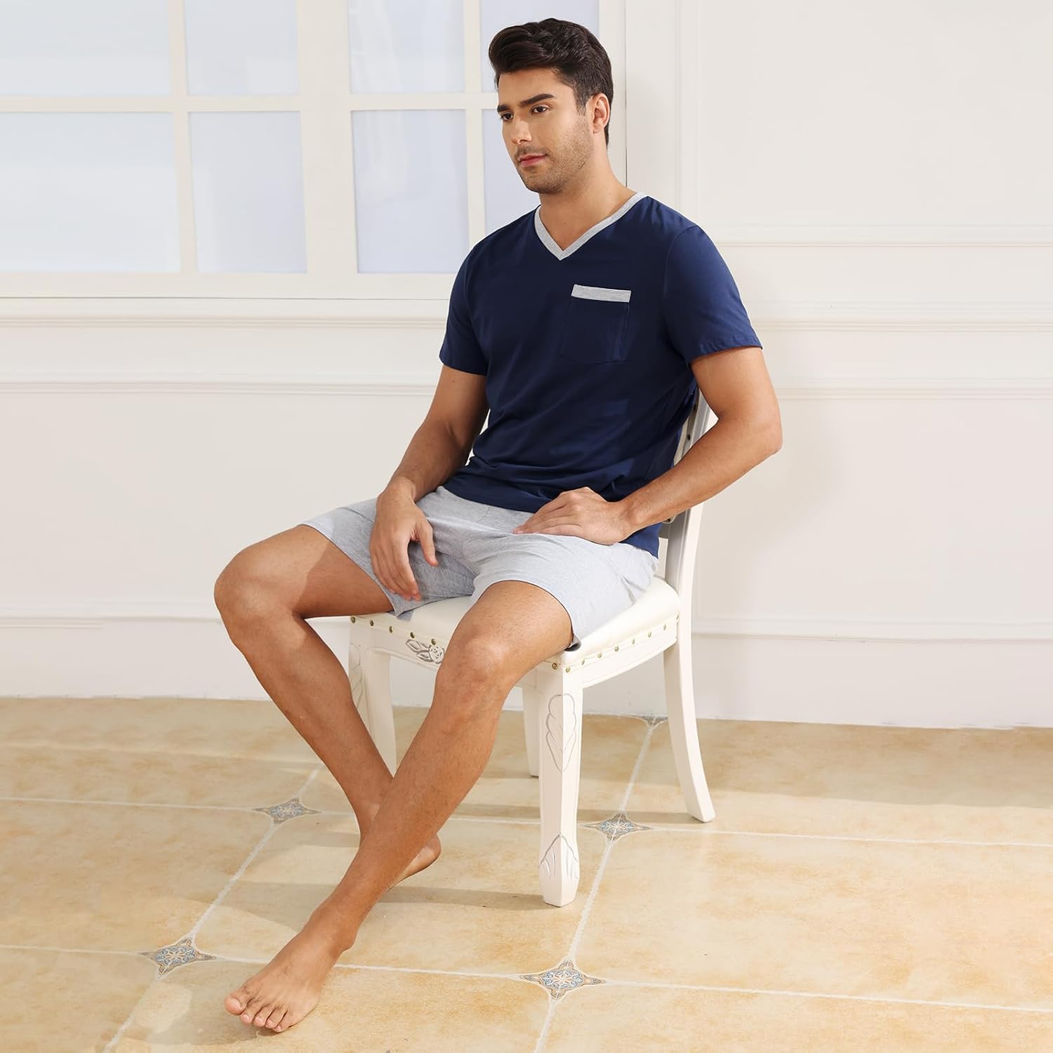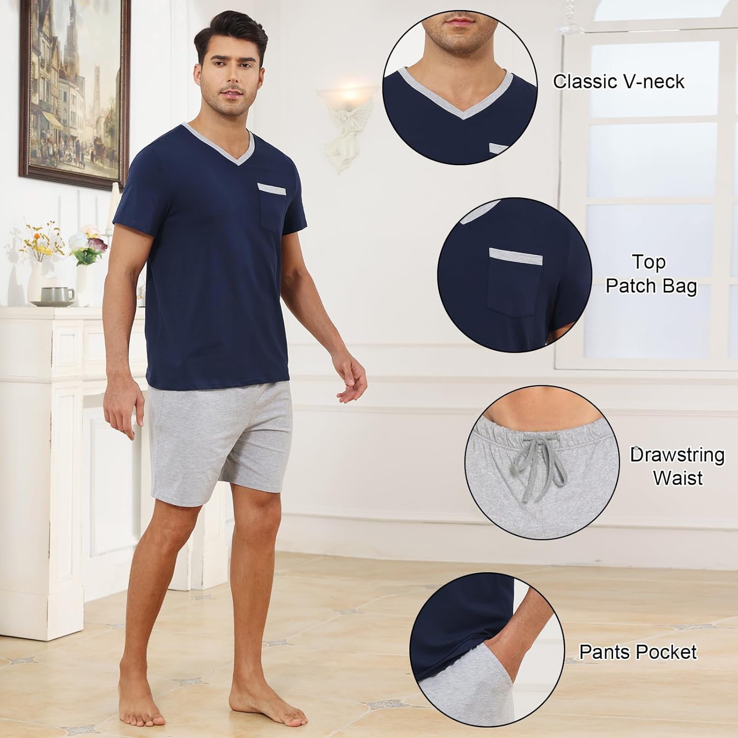 Men’s cotton pajama set v-neck T-Shirt short sleeve top: 95% cotton, 5% spandex; pants: 95% polyester, 5% spandex, softer, smoother, skin-friendly, light, moisture-wicking experience than normal cotton.