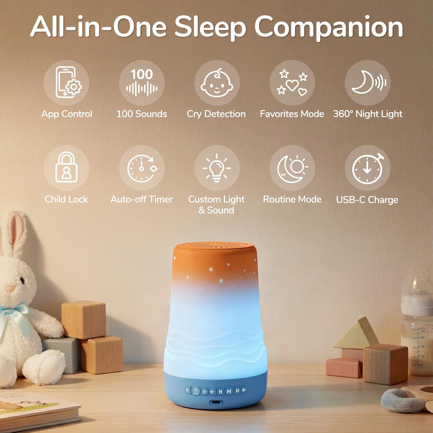 【AI CRY DETECTION & SMART SOOTHING】Smart cry detection activates a preset calming combination to support nighttime care without entering the room