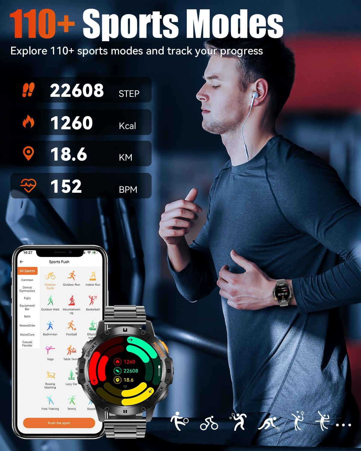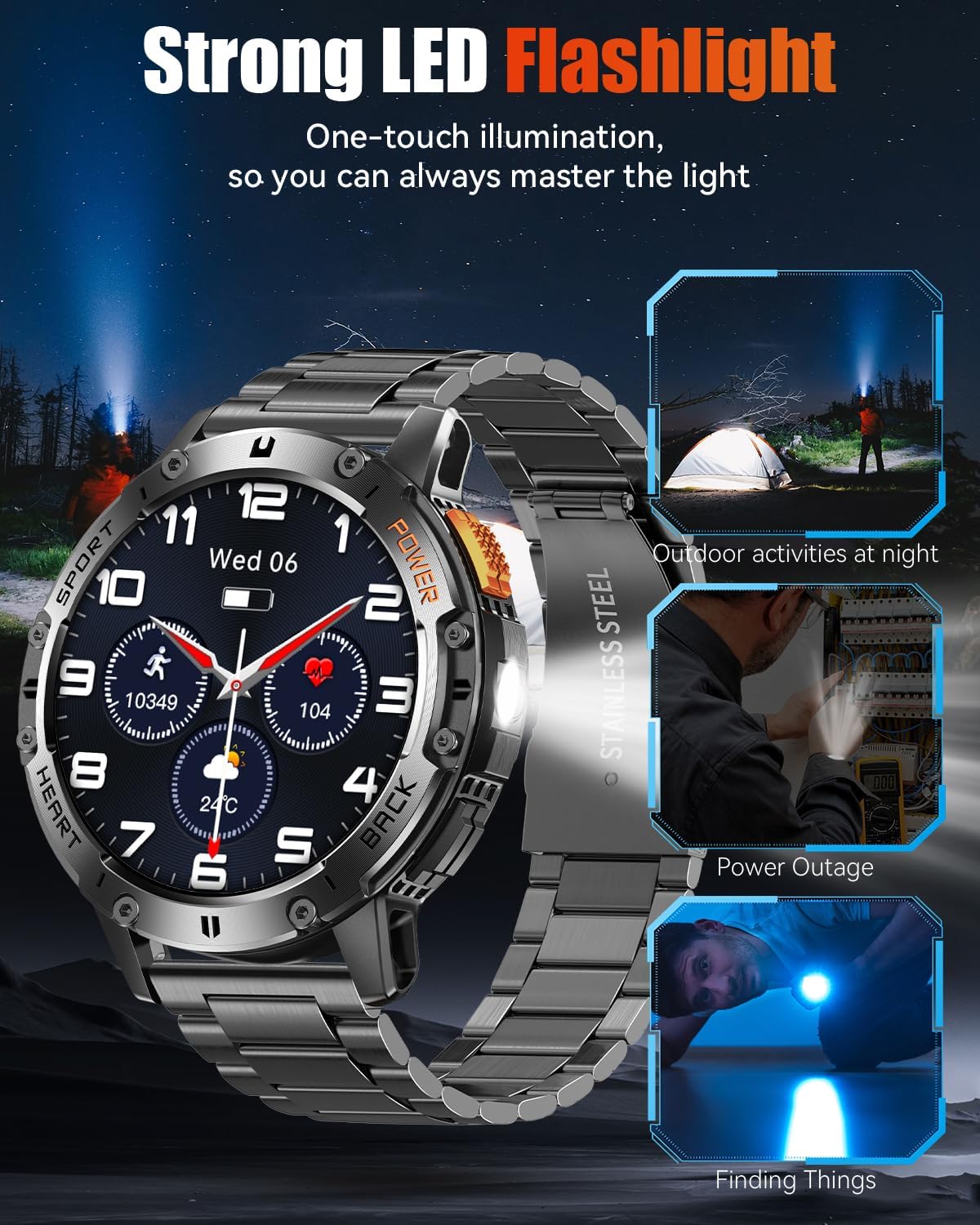 【Military-Grade Durability & IP68 Waterproof】 This Military-grade smartwatch built to withstand the toughest environments, Designed for extreme temperatures, dust resistance, and salt spray, it guarantees durability against shocks, water, and dust. With an IP68 waterproof rating, it’s perfect for everyday use like handwashing, showering, or rainy hikes, making it a reliable companion for both outdoor adventures and rugged work conditions. (avoid using it for diving).