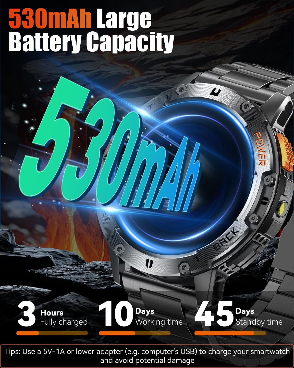 【530mAh Battery & Built-In Flashlight】 Equipped with a military-grade 530mAh battery, this smartwatch offers 5-10 days of use and up to 45 days of standby on just 2-3 hours of charging. It also features a built-in flashlight, making it an essential tool for camping, hiking, and nighttime activities. Whether you’re in an emergency or need extra light during car troubles, this smartwatch ensures you’re always prepared.