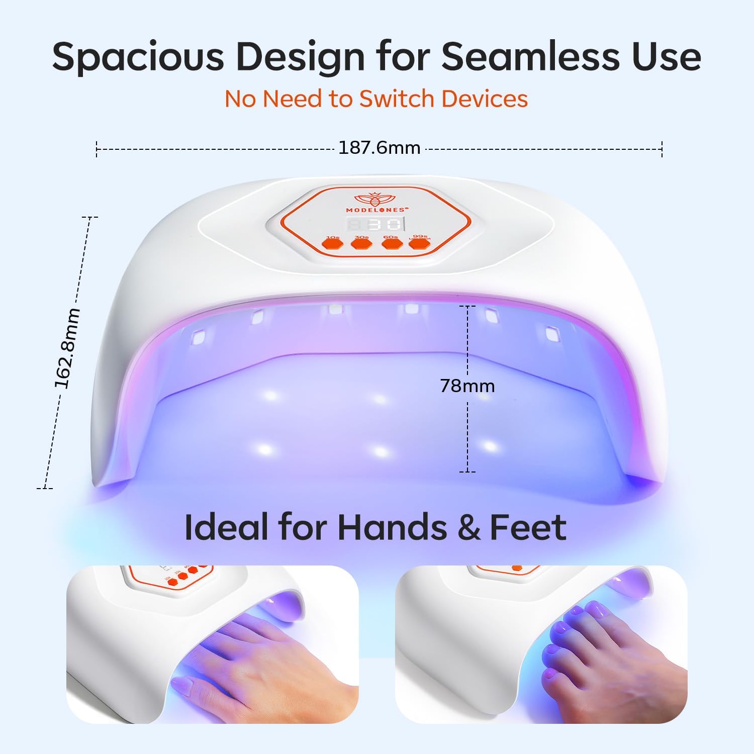 Versatile Compatibility for All Needs – Modelones uv nail lamp equipped with UV/LED dual-light technology and upgraded high-transparency beads, it dries quickly to cut waiting time. The safe 365nm+ 405nm UV&LED wavelengths work with all gel polishes—base coat, top coat, color gel, acrylic gel, builder gel, nail tips, and press-ons