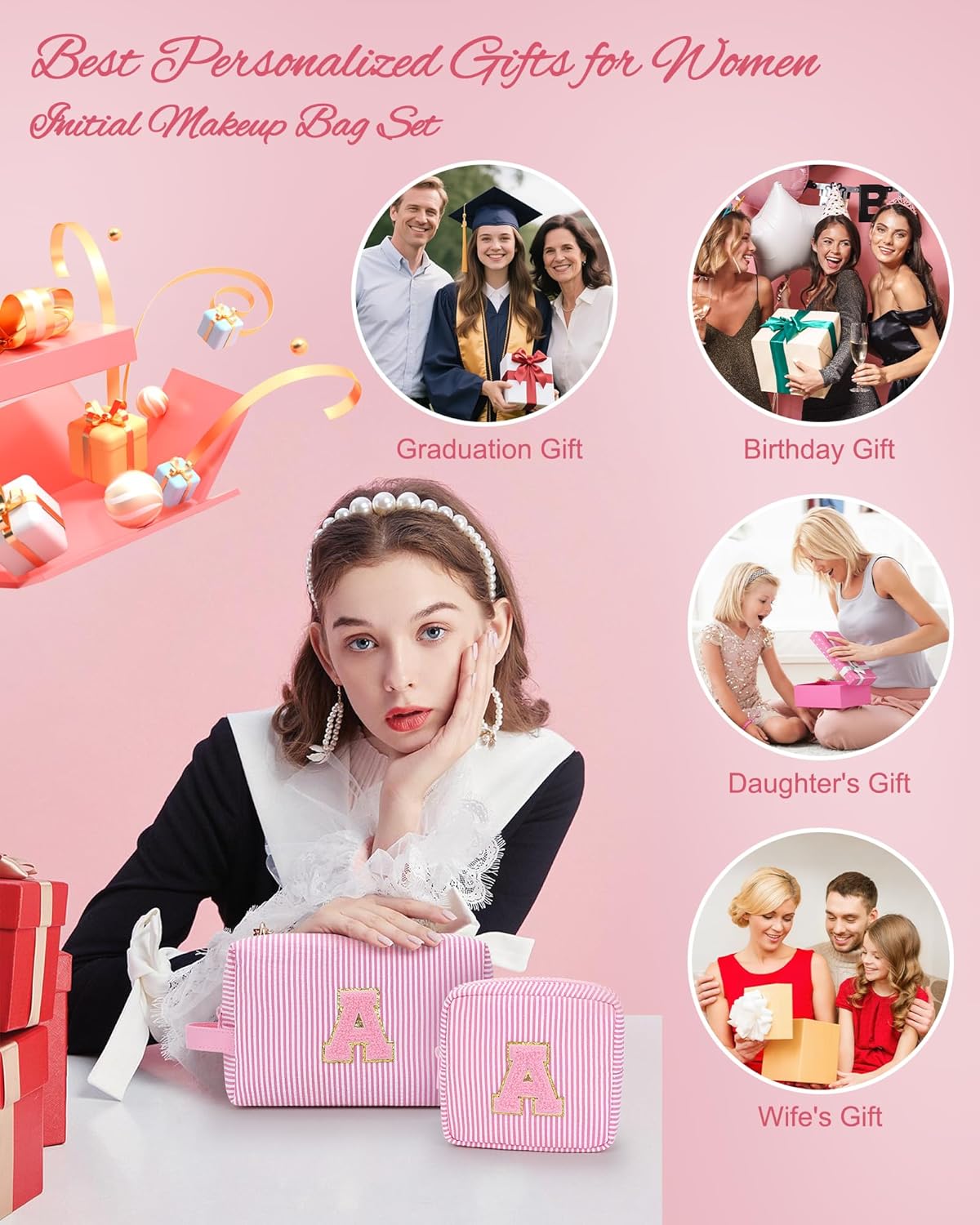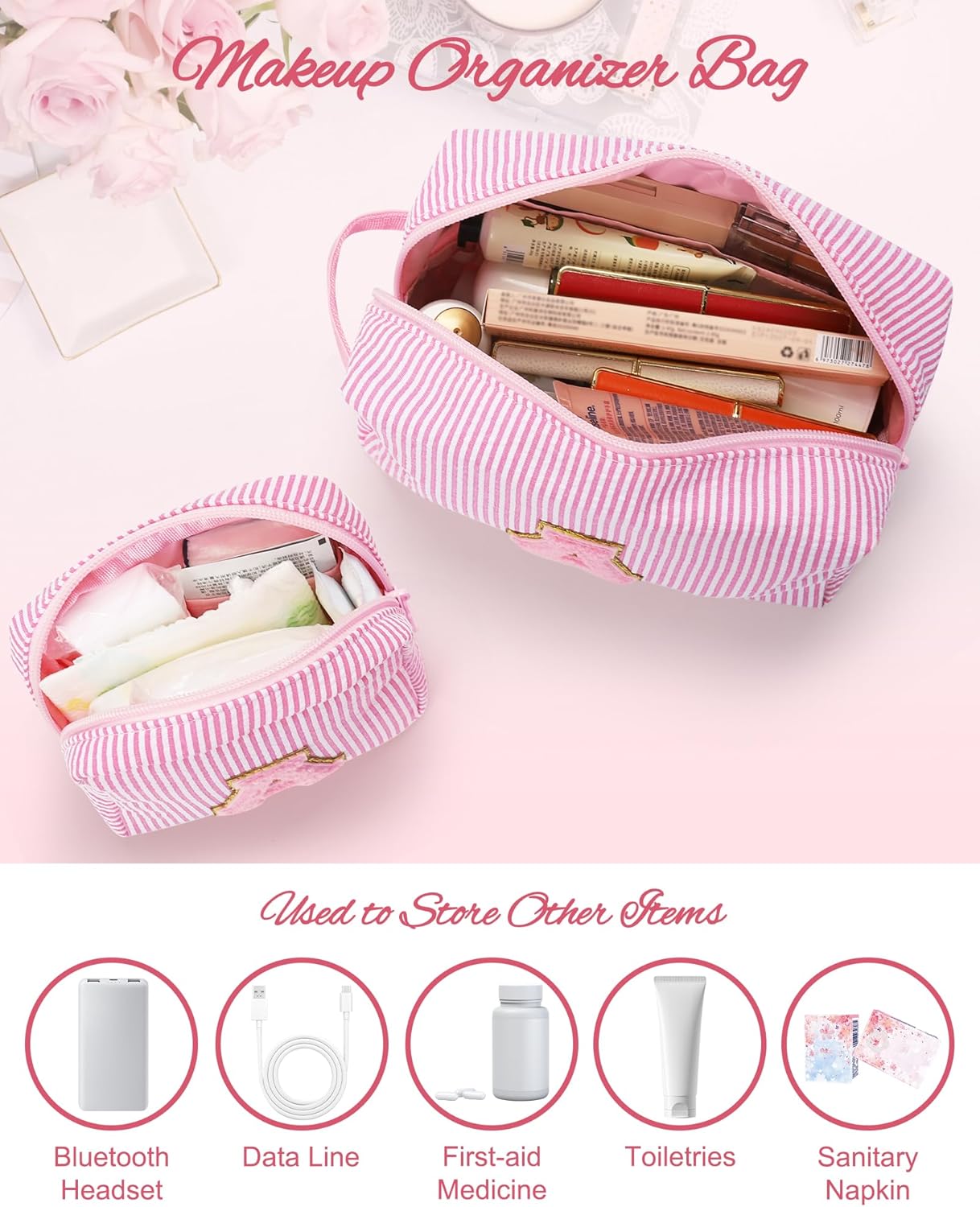 【Package Include】: 1*Personalized initial large makeup bag+1*Preppy chenille letter purse mini bag.The large bag size:21.5*9.5*14cm/8.46*3.74*5.51inch,the small one is 14.5*5*13.5cm/5.71*1.97*5.31inch.Get both value and convenience with this set featuring a large and a small stylish pink vertical stripe cosmetic bag, perfect for organizing all your essentials in different sizes