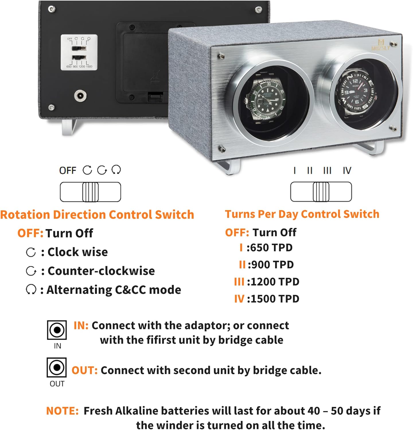 MOZSLY Double Watch Winder for Automatic watches Quiet Motor PU Leather Fashion design: MOZSLY watch winder selected orange PU leather and clear acrylic glass give this watch winder box a comfortable touch and a nice look, a great gift option. Multiple MOZSLY watch winders can be connected to a bridge cable and work simultaneously. ModeⅠ:650 TPD Slide Timer Switch to position Ⅰ to set the winding function at rotating 3’ 28 minutes & rest for 56‘ 32 minutes in one hour and then repeat the above rotation in all one-hour cycles. ModeⅡ:850 TPD Slide Timer Switch to position Ⅱ to set the winding function at rotating 4’ 48 minutes & rest for 55‘ 12 minutes in one hour, and then repeat the above rotation in all one-hour cycles. Mode Ⅲ:1050 TPD Slide Timer Switch to position Ⅲ to set the winding function at rotating 5’ 28 minutes & rest for 54‘ 32 minutes in one hour, and then repeat the above rotation in all one-hour cycles. Mode Ⅳ:1250 TPD Slide Timer Switch to position Ⅳ to set the winding function at rotating 6’ 28 minutes & rest for 53’ 22 minutes in one hour, and then repeat the above rotation in all one-hour cycles