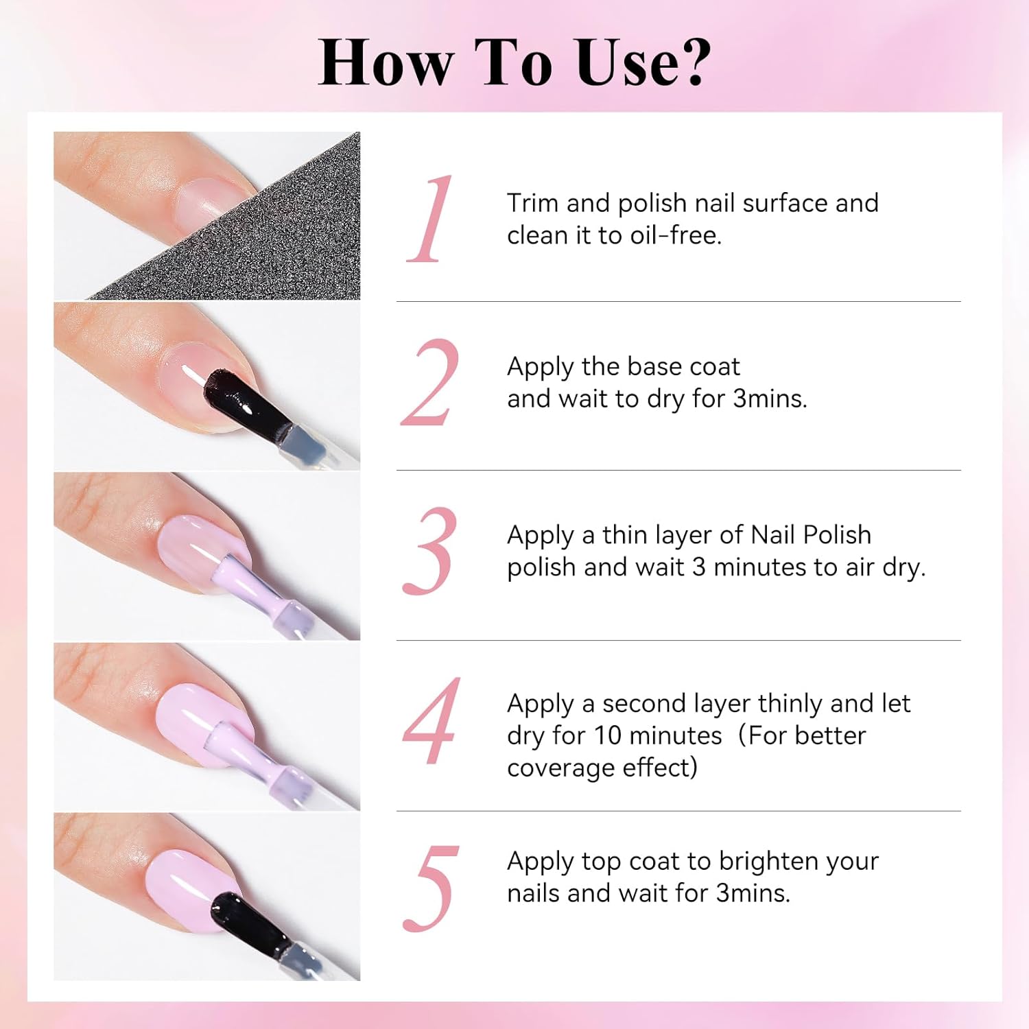 Warm Tips: It is recommended to apply a base and top coat to protect the lasting effect of nail polish better; 1 coat of nail polish takes 2 minutes to air dry, and 2 coats will take 10 minutes, you can speed it up with a Hairdryer or Electric Fan