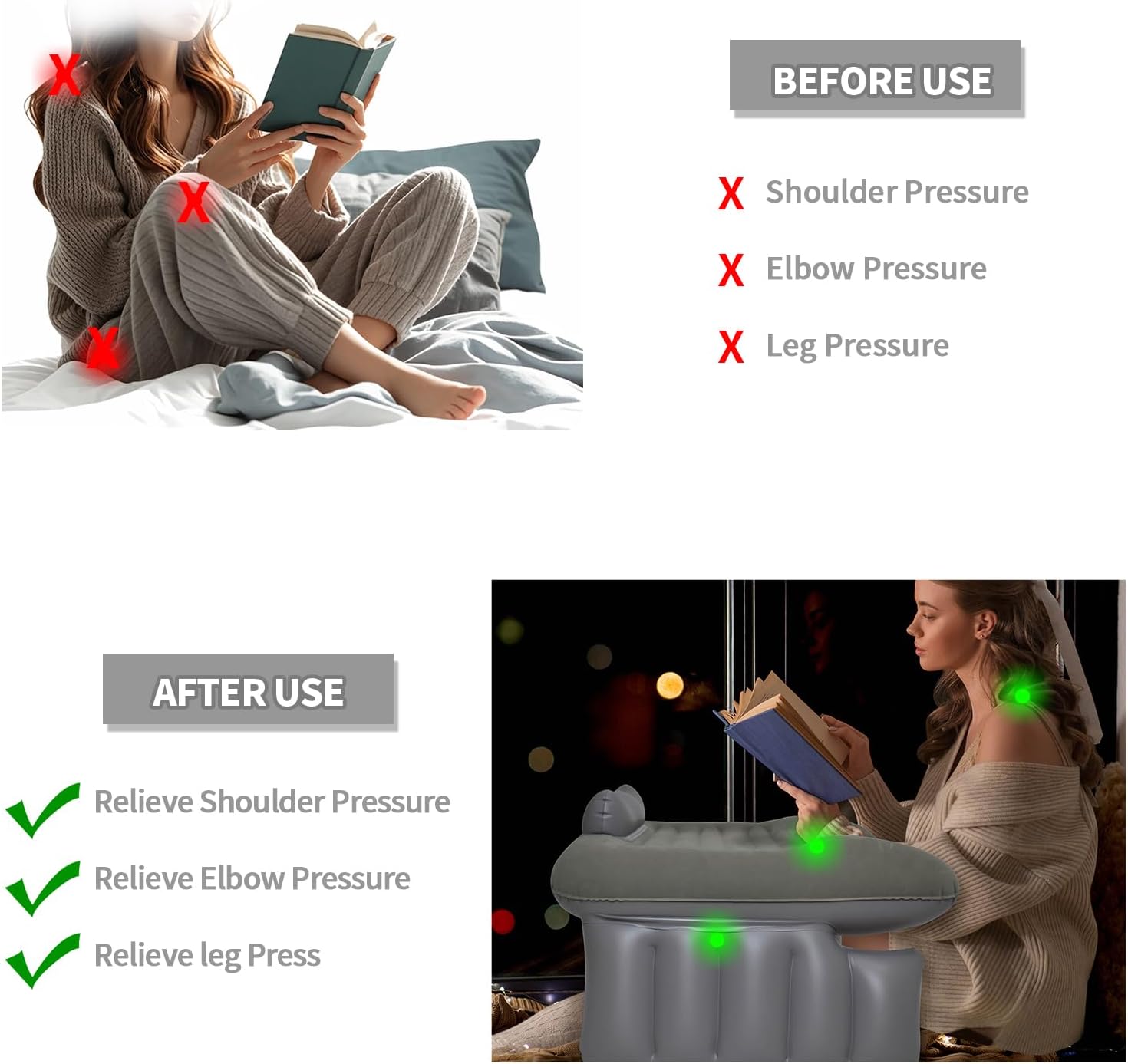 Ultimate Comfort & Ergonomic Support Enjoy hands-free reading, working, or browsing with our inflatable reading pillow. The raised side arms provide optimal support for your arms and back, reducing strain on your neck, shoulders, and wrists. Perfect for prolonged use in bed or on the couch.