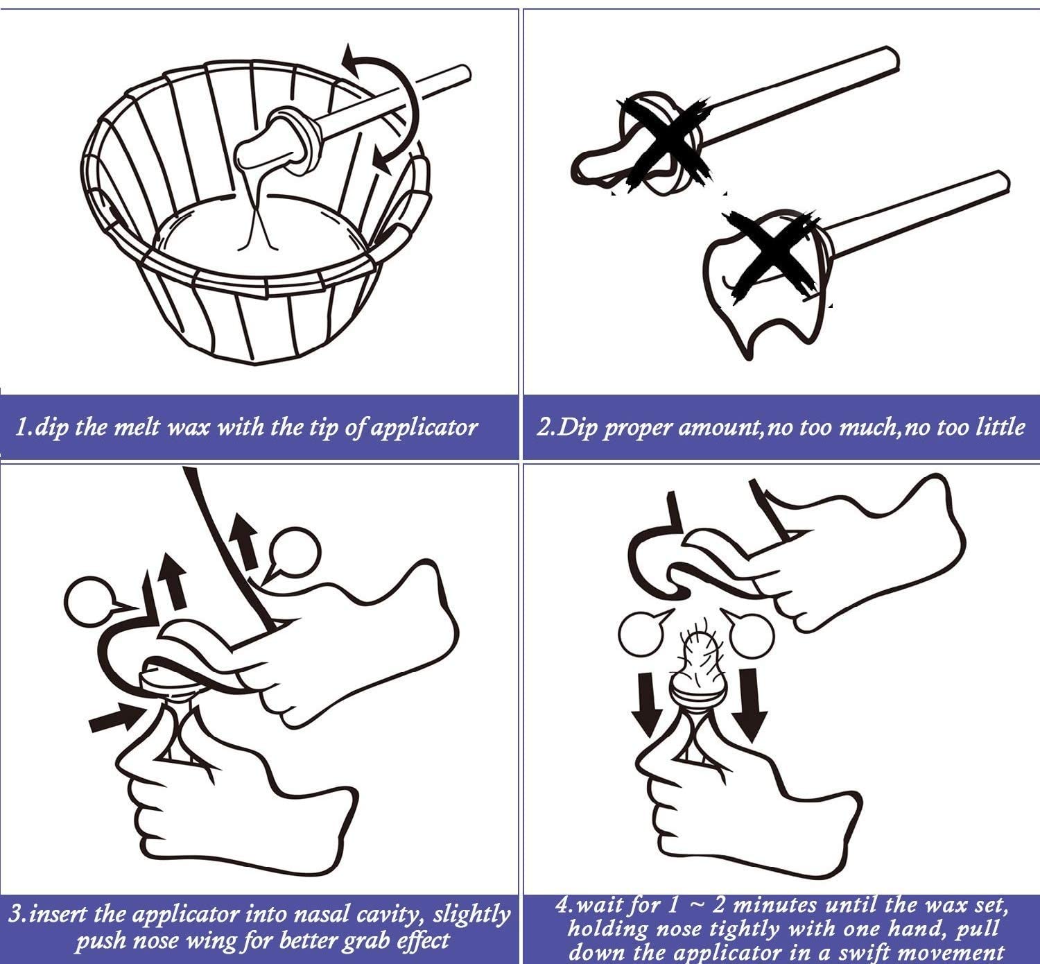 While inserting the applicator into the nostril, slightly rotate the applicator and push the nose wing to get better grab effect. Wait about 1~2 mins until the wax set.