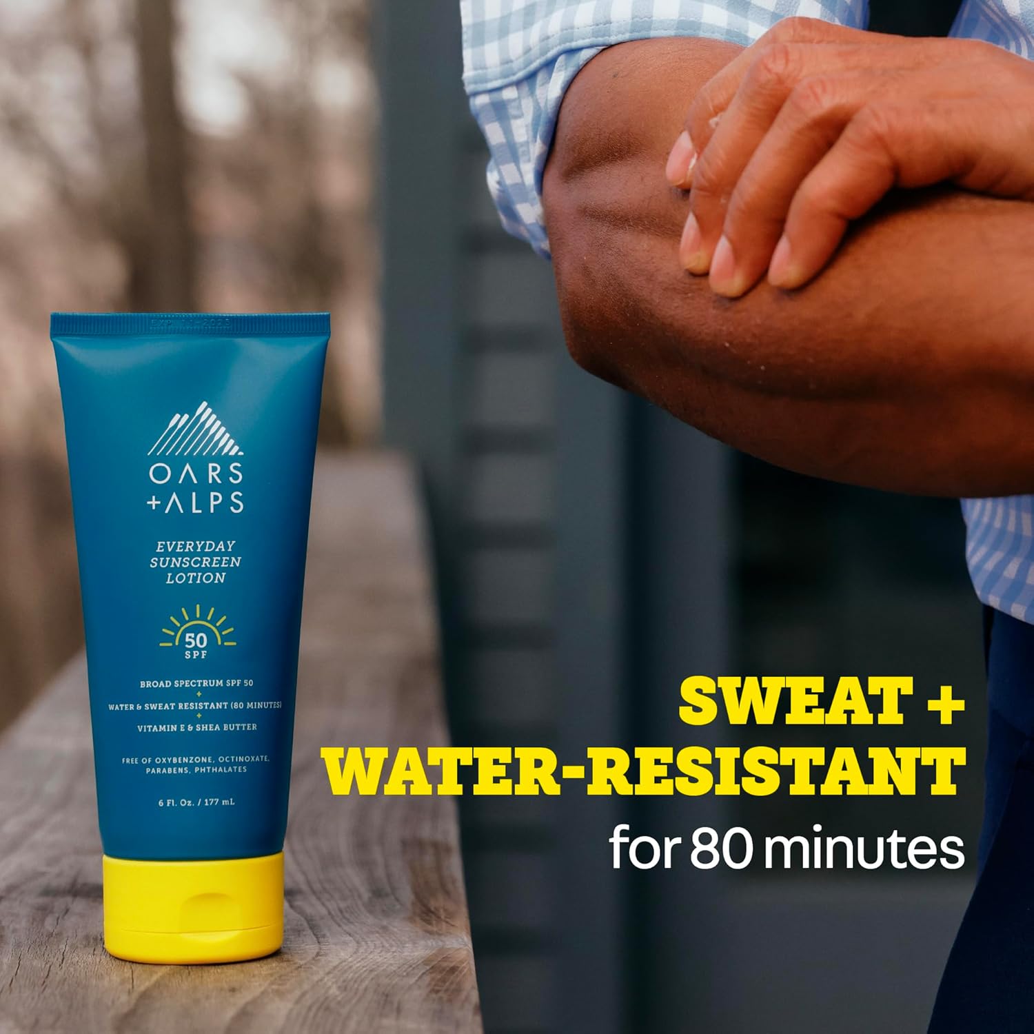 Oars + Alps Sunscreen Body Lotion for Everday Use, SPF 50 Body & Face Sunscreen Lotion, Infused with Aloe Leaf & Vitamin E, No White Residue, Water & Sweat Resistant, All Skin Types, Lightweight, 6oz