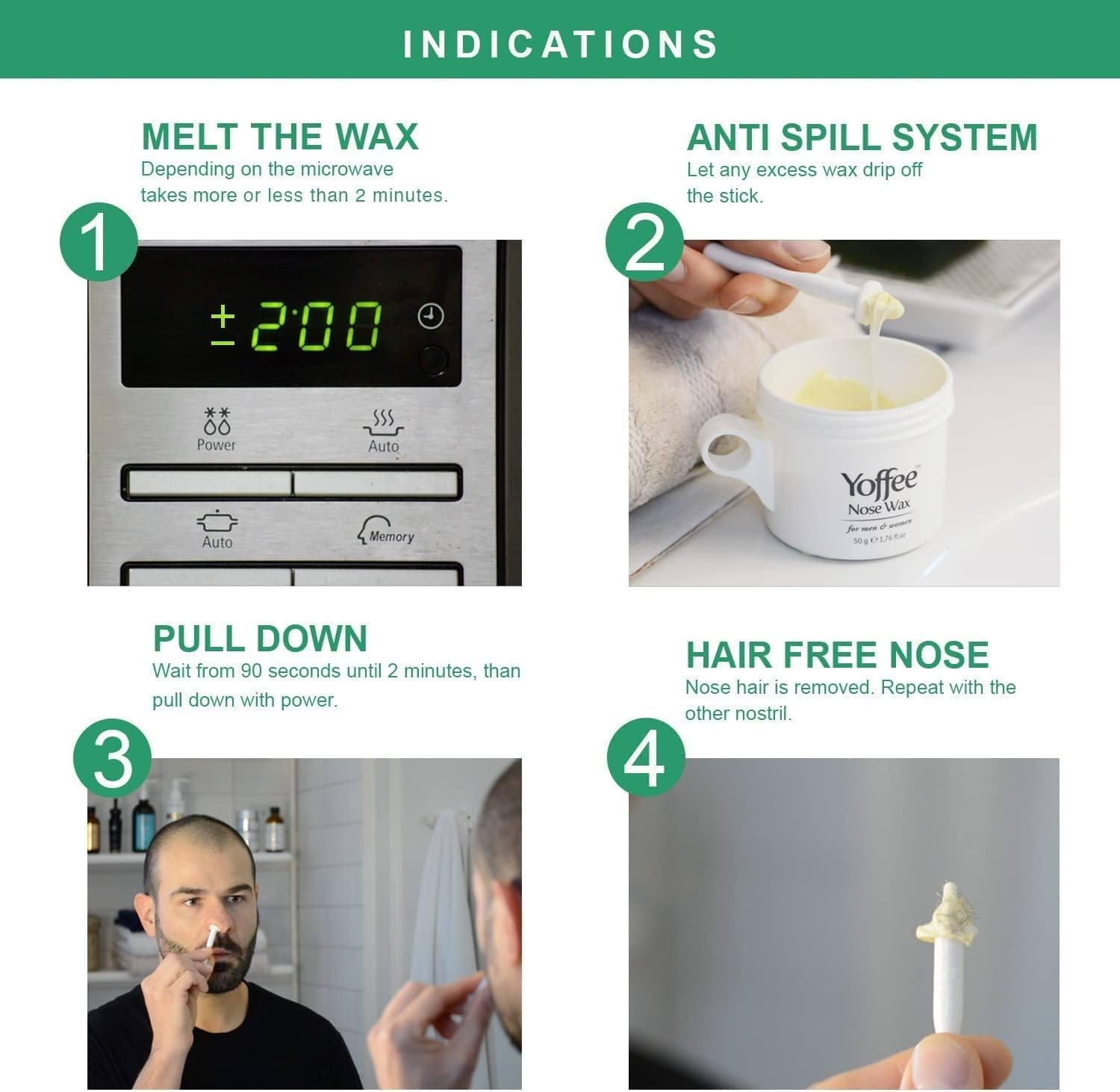 Heat the jar of wax in the microwave for several minutes.Dip the end of the Yoffee Nose Wax applicator into the melted wax.Insert the tip into the nostril until the rim of the applicator makes contact.Do not move or twist the applicator. Wait 90 seconds for the wax to cool. Do not leave for more than two minutes.Grasp the applicator firmly and remove it with a quick downward movement. Discard the stick after use.Repeat the process with the other nostril.