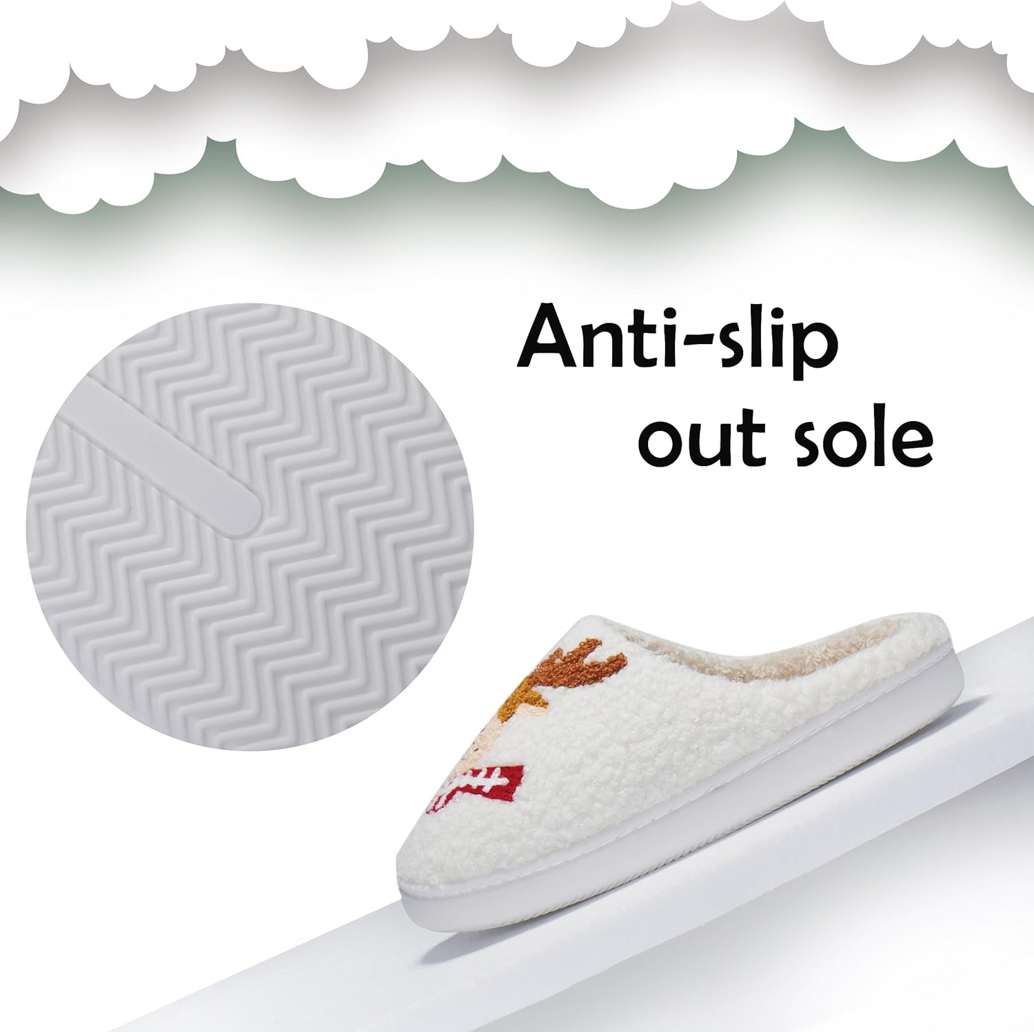 PepStep Cozy House Slippers for Women, White Plush with Reindeer Design, Fleece Lined, Indoor Winter Comfort