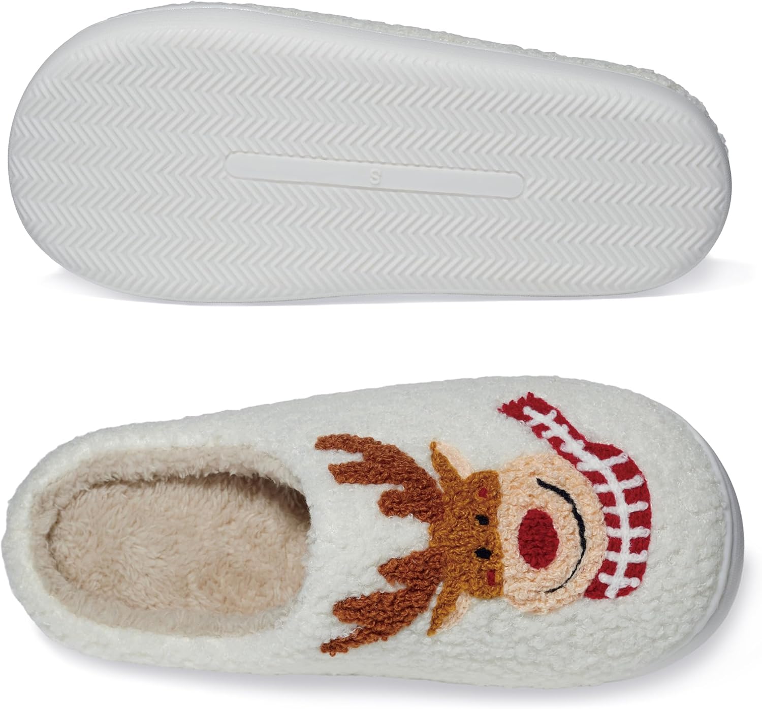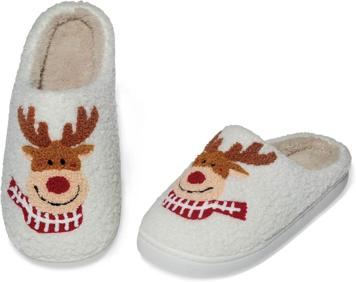 Bring warmth and cheer to your feet with these adorable reindeer-themed house slippers. Crafted with plush white material and featuring a charming reindeer design complete with brown antlers, red nose, and a festive red and white striped scarf, these slippers are perfect for cozy winter nights. The soft fleece lining provides exceptional comfort and warmth, while the durable construction ensures lasting wear. The slip-on design makes them easy to put on and take off, ideal for quick trips around the house. The cute smiling reindeer face adds a whimsical touch that’s sure to brighten your day. These indoor slippers combine style and comfort, making them an excellent choice for lounging at home during cold weather seasons. The plush cushioning provides comfort for tired feet while the non-slip bottom helps prevent sliding on indoor surfaces. Available in women’s sizes, these slippers make for a delightful addition to your at-home comfort wear or a thoughtful gift for someone special.