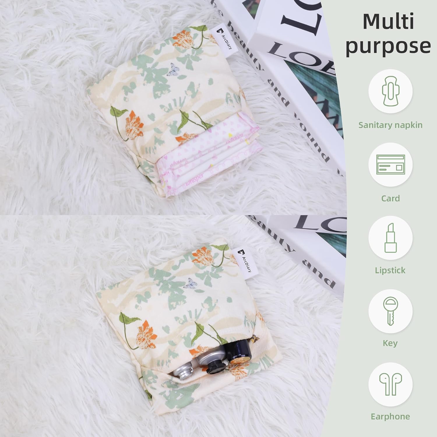 【Multifunctional】This menstrual pad pouch is perfect for storing sanitary napkins, tampons. It is also a multi-functional wallet for storing your personal belongings or some miscellaneous items: jewelry, cosmetics, credit cards, and so on. These menstrual pad pouches are suitable for daily use in office, school, dating, traveling, hotel, indoor or outdoor and more.