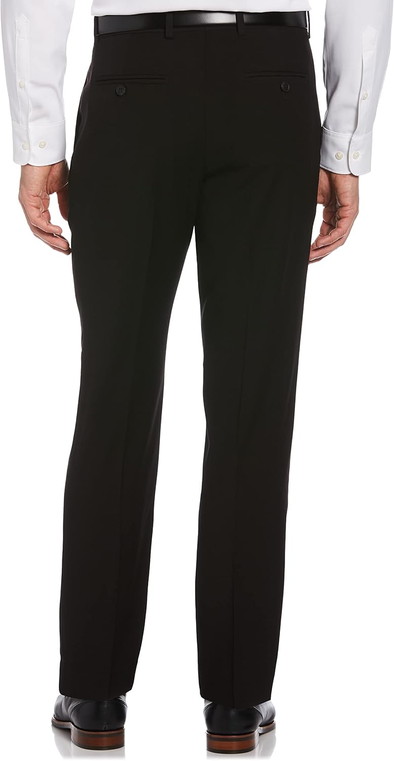 Elevate your style with this Perry Ellis Solid Stretch Suit Pant, your new favorite wardrobe essential. Designed for convenience, these pants are non-iron and machine washable, making them easy to maintain. Made with performance stretch fabric which ensures maximum comfort all day long, the solid-colored design adds a touch of sophistication to any outfit. With a flat waistband that expands for added breathing room and flexibility, these pants offer a customized fit that moves with you. Plus, the slash pockets on the front and the back welt pockets with button closures combine functionality and style, providing ample storage space for your essentials. Their straight leg fit, slimmer through the thighs and sitting at the waist, offers a modern and flattering silhouette. And the crosshatch woven pattern adds visual interest and texture to elevate your overall look. Experience the perfect blend of comfort, style, and versatility with these suit pants for men.