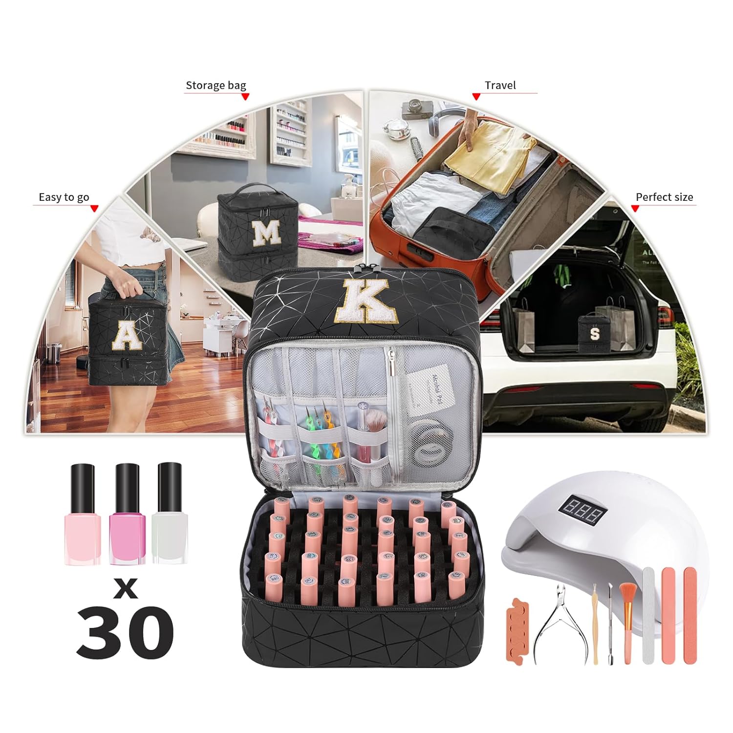 Nail Polish Organizer with UV Light Storage :The large storage space is designed mainly for your UV LED Nail Lamp and nail polish supply storage. The design of the hook and loop fastener partition can effectively use the storage space, and the 30 sponge partition can store different styles of nail polish.(Holds 30 Bottles)
