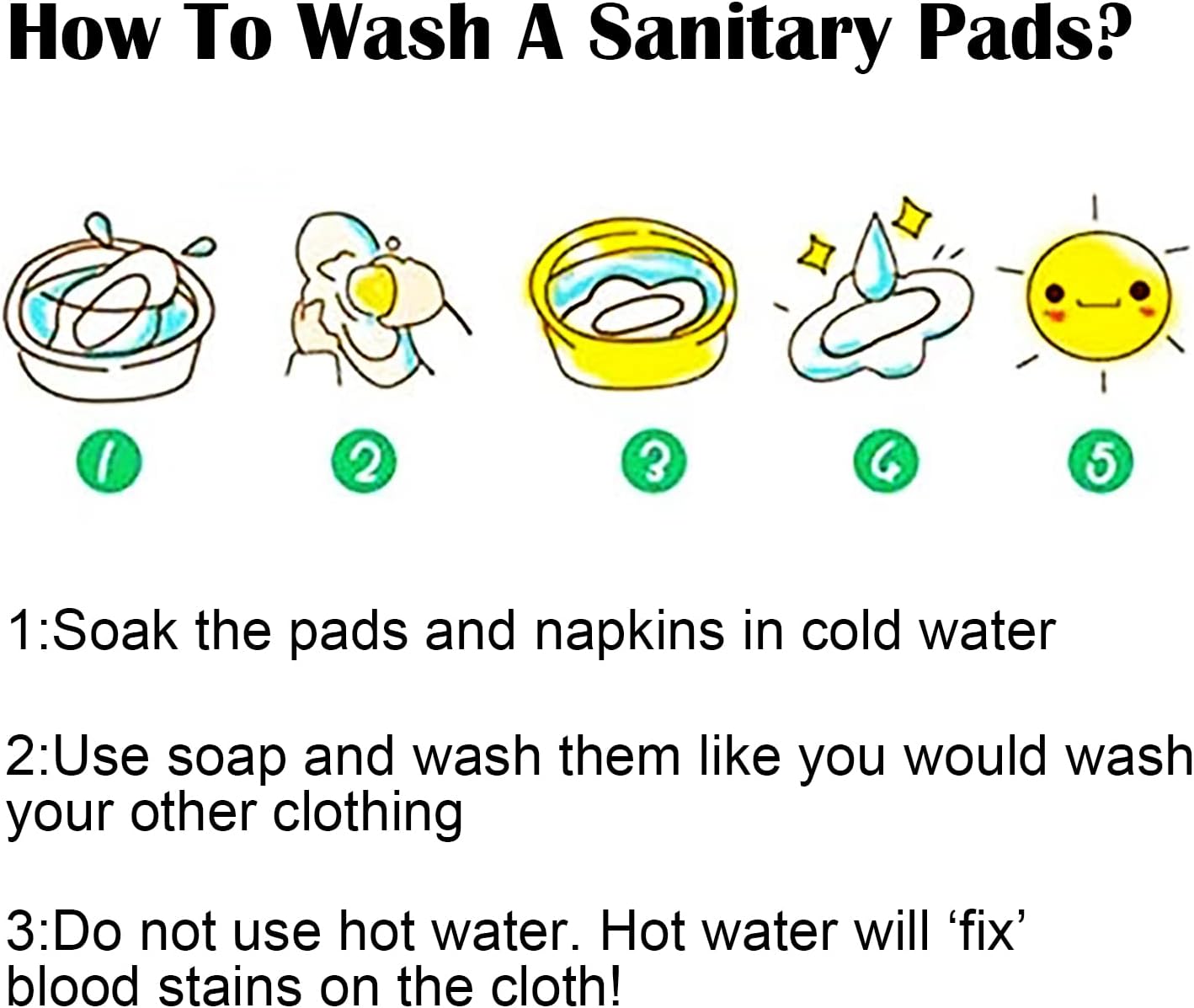 2. If there are dirt on it, you can add a little salt in cold or warm water (do NOT use hot water as this can set any dirt) to wash by hand or machine. If you are not planning to wash right away, you can soak your cloth menstrual pad or let them dry until your next laundry.