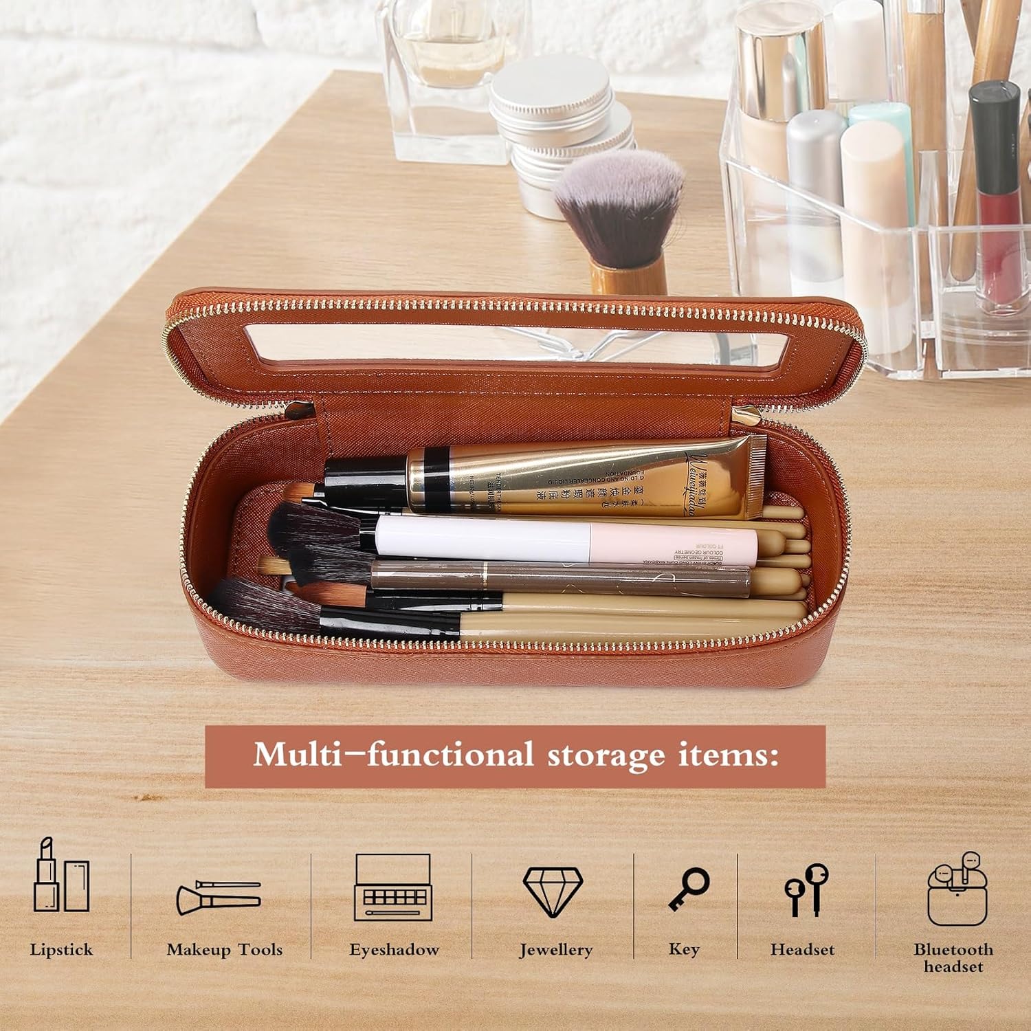 Pinkmik Makeup Brush Case Clear Travel Cosmetic & Toiletry Bag Small Makeup Bag with Zipper Purse Organizer Car Essential Bag for Women (X/Brown, SLIM)