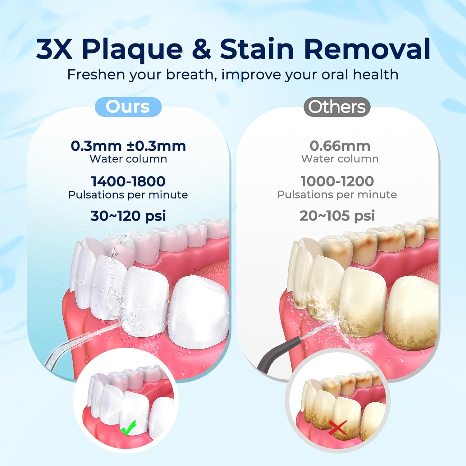 5 Custom Modes for Personalized Care – Switch between Strong, Standard, Gentle, Pulse, and Kids’ modes (30-120 PSI) to suit sensitive gums, braces, bridges,or family use. With 1400-1800 pulses/minute, this water flosser portable removes 99.9% of dental stains, food debris while being gentle enough for kids and seniors.