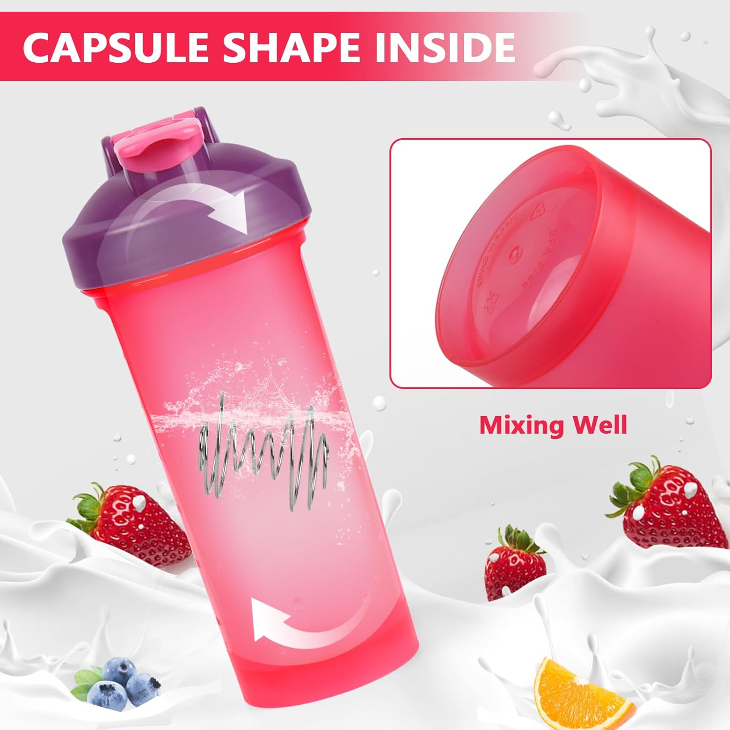 Made from high-quality food-grade plastic, this shaker bottle has safety and durability. Whether you’re mixing protein shakes, pre-workout drinks, or post-workout recovery formulas, our leak-proof design ensures that you can carry your favorite beverages. The bottom curved capsule design, paired with the stainless steel mixing ball, ensures quick and uniform mixing. The clear and precise dual-scale markings in ml and oz make it easy to measure and mix your drinks accurately, giving you the perfect consistency every time. The protein cup with a portable handle is an ideal companion for exercise, outdoor activities, and even daily use. Our shaker is perfect for your active life!