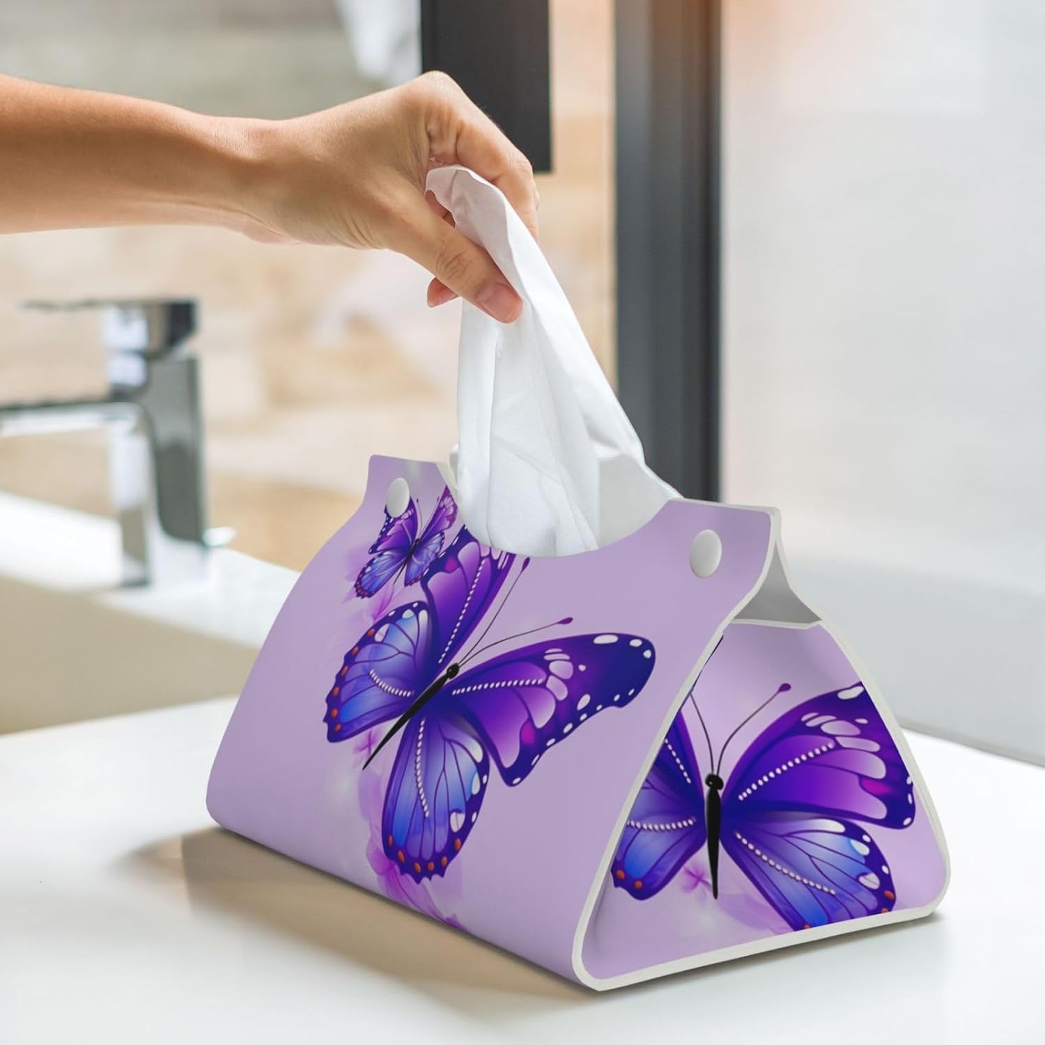 Ideal Size: With dimensions of 7.9 x4.9 x4.5 in, our Decorative Tissue Cover for Bathroom Purple Butterfly rectangle tissue box holder is a universal size that fits most brand tissue packs seamlessly. It’ s an ideal gift for housewarming or home decoration
