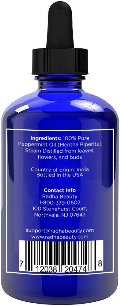 Radha Beauty Peppermint Essential Oil 4 oz – 100% Pure & Therapeutic Grade, Steam Distilled for Aromatherapy, Fresh Minty Scent, Focus, DIY Projects, Candles, Sprays and Fragrance