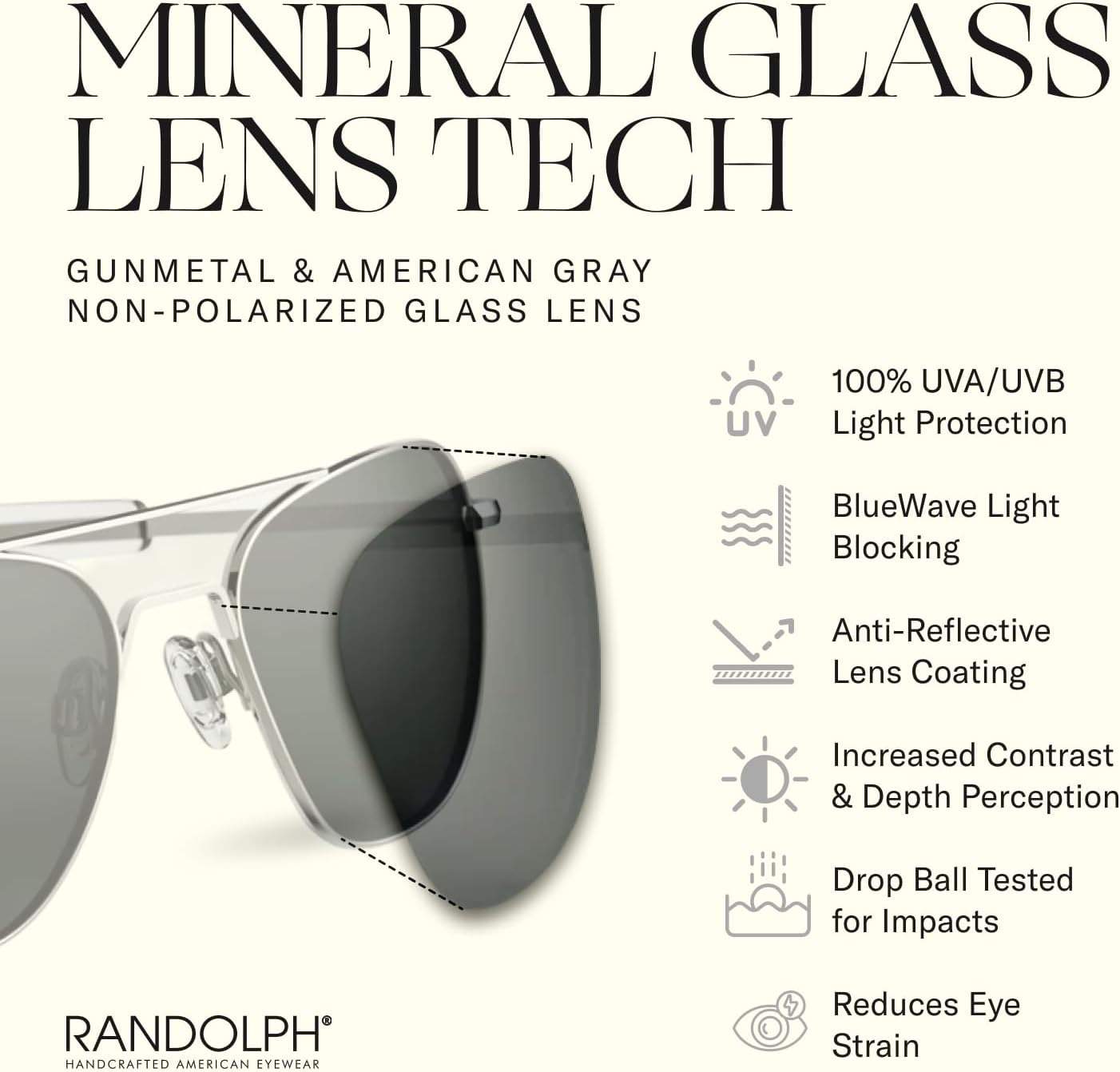 The Gunmetal Classic Aviator Embrace style, sophistication, and craftsmanship with our classic and iconic mens and womens Aviator sunglasses. Specifically engineered to meet military pilot standards, they’re made to last a lifetime while providing exceptional protection and comfort. Our lenses are made with SkyTec glass that features Vector Anti-Reflective & Blue Wave lens technology, for clear, sharp imagery. They provide both UVA and UVB protection, and are available as both polarized glasses and non-polarized sunglasses to match personal preference and need. The frames of The Aviator feature a gunmetal jewelry quality finish for a durable and lasting frame, that also includes solder joints made to last and stay-snug screws and hardware. Our collection of men and womens sunglasses are made from premium quality materials made to endure a lifetime of wear. Our superior materials are also met with superior comfort, with clear Bayonet temple tips and anti-allergy nose pads on our aviator sunglasses, as well. These frames are available in three sizes, to allow you to opt for the most secure and comfortable fit for you. We make these available in 52mm, 55mm, and 58mm sizes. Unsure of your size? To measure: while looking at a mirror, hold a ruler horizontally across your face, then measure the distance in inches between your left and right temples. For 5”, opt for the 52mm lenses, for 5.25” opt for the 55mm lenses, and for 5.75” opt for the 58mm lenses. Made for the perfect fit, these are the sunglasses men and women prefer! Since 1973, Randolph has crafted authentic American eyewear with a focus on performance, style, and quality. Proudly made in Randolph, MA, our sunglasses are handcrafted and trusted by U.S. military pilots and naval captains. Family-owned and operated, we blend timeless design with modern durability—worn by everyone from fighter pilots to Hollywood stars. We prioritize American-sourced materials and partner with top global suppliers to meet our exacting standards.