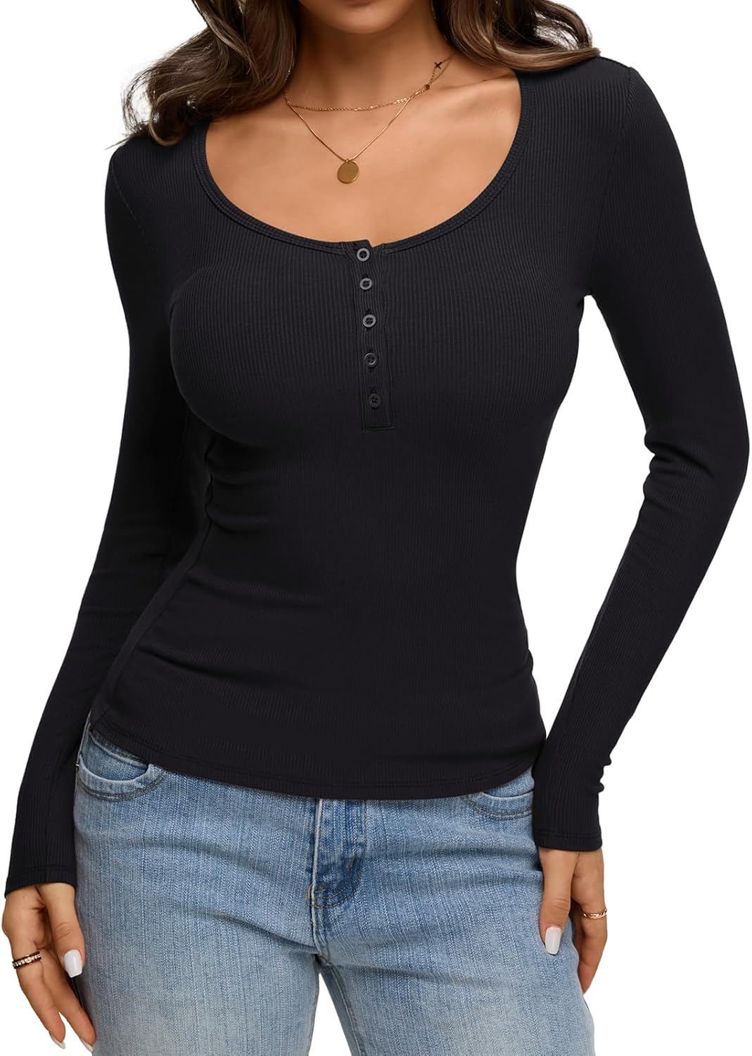 REORIA Women’s 2025 Fall Long Sleeve Henley T Shirts Button Ribbed Knit Slim Fit Casual Basic Tops Blouse