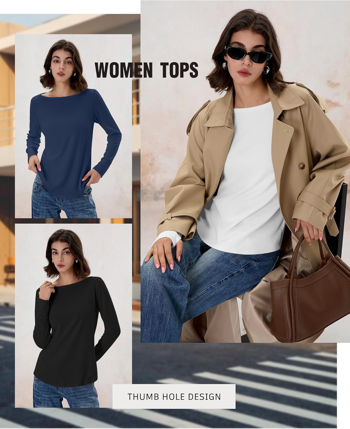 Riyiper 3 Pack Women’s 95% Cotton Long Sleeve Shirt with Thumb Hole, Boat Neck Casual Tunic Tops 2025 Fall Trendy Basic Tees