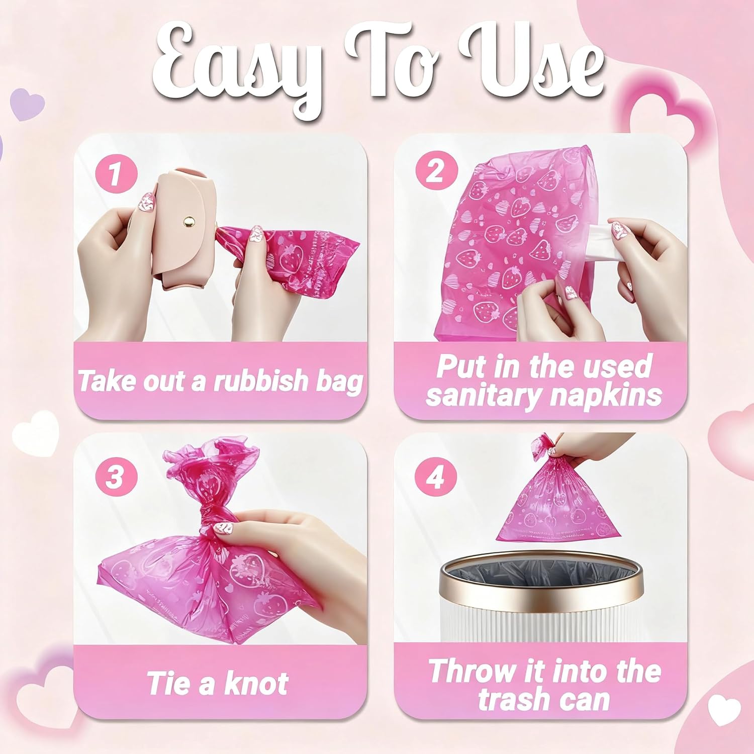 [Durable Material]: Made from safe, high-quality plastic, these sanitary napkin disposal bags are durable and leak proof. The strawberry and heart prints help hide the contents, ensuring privacy. The bags feature a secure seal to prevent leaks and maintain a clean and fresh environment
