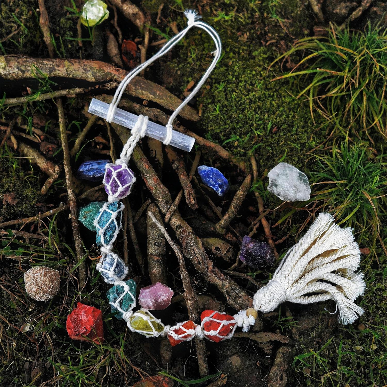 Selenite Crystal Hanging Chakra Wall Decor, Handmade Large 7 Healing Natural Stones, Spiritual Good Luck Ornament for Yoga Meditation Accessories Reiki Anxiety Relief, Gift for Women and Kids