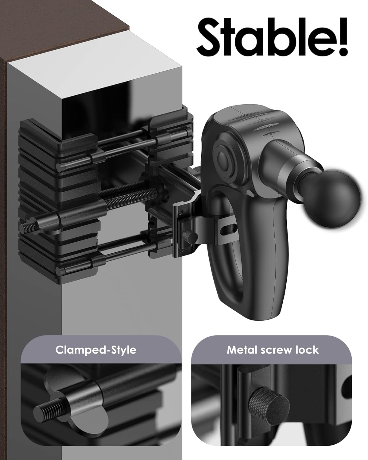 MASSAGE GUN HOLDER PRO- A must have massage companion for your massage gun. We use aluminum alloy for the front part and the combination with the clamping part, more strong and stable when you use. With our massage gun holder PRO, you can use massage gun to massage any part of your body HANDS FREE, especially the place where you can hardly to reach with your hand, such as back, butt, and outside of arm.
