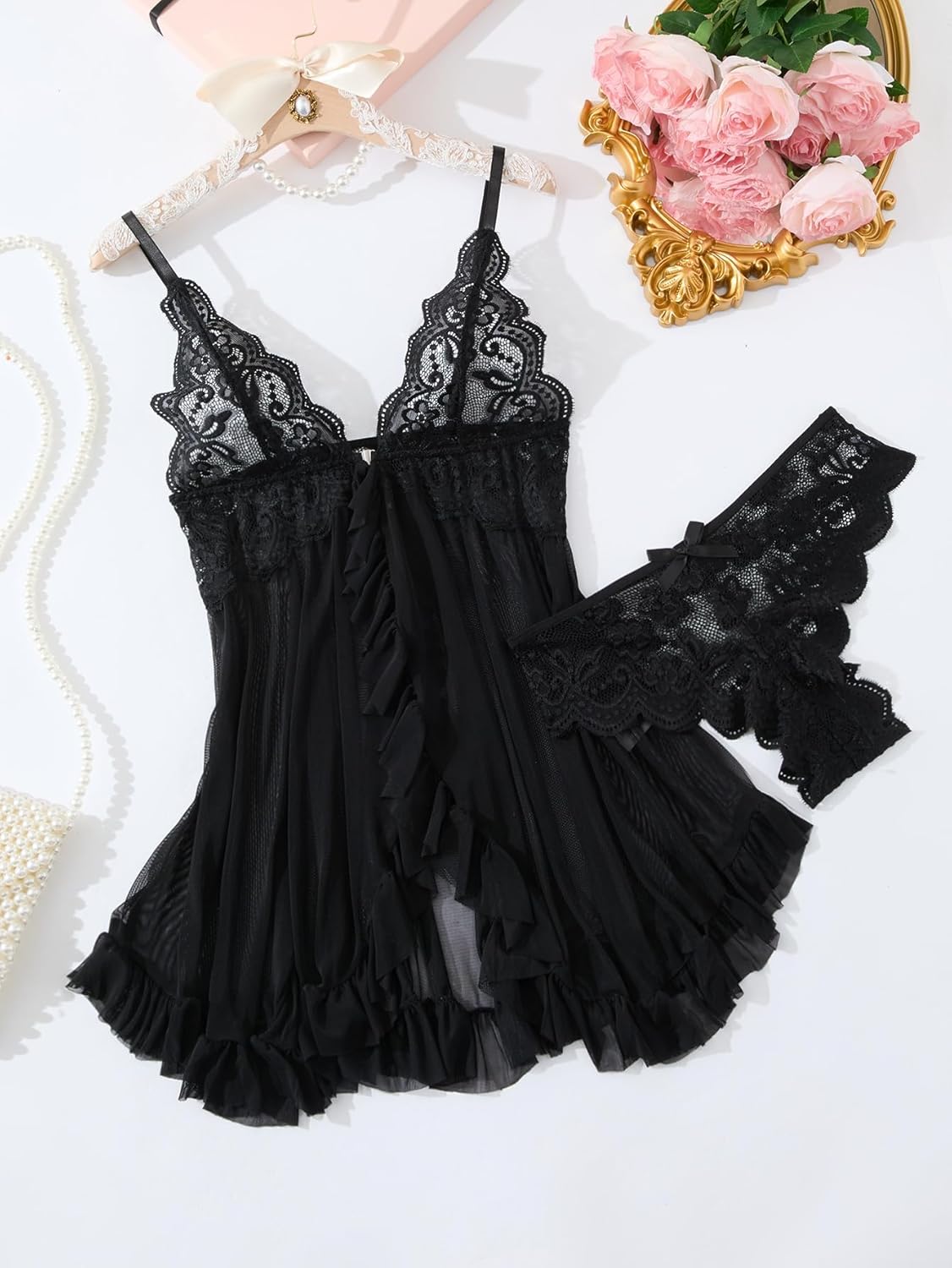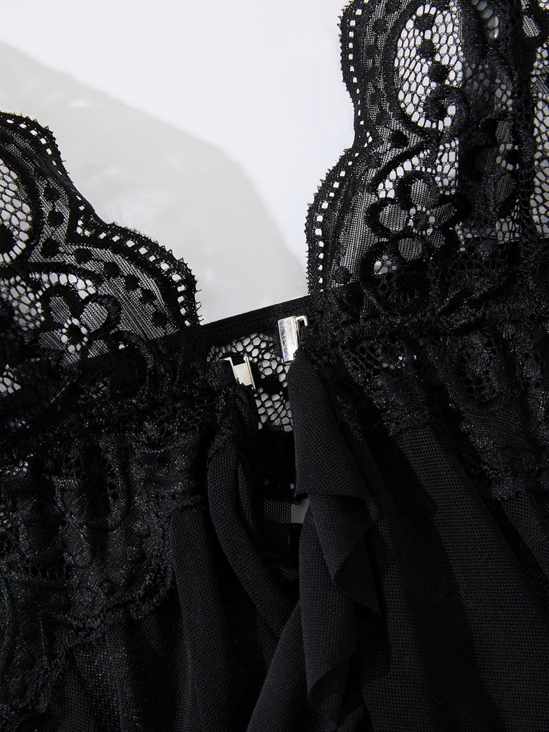 Sexy Front Closure Ruffle Mesh Floral Lace Sheer Wireless Babydoll Lingerie Dress with Thong 2 Piece