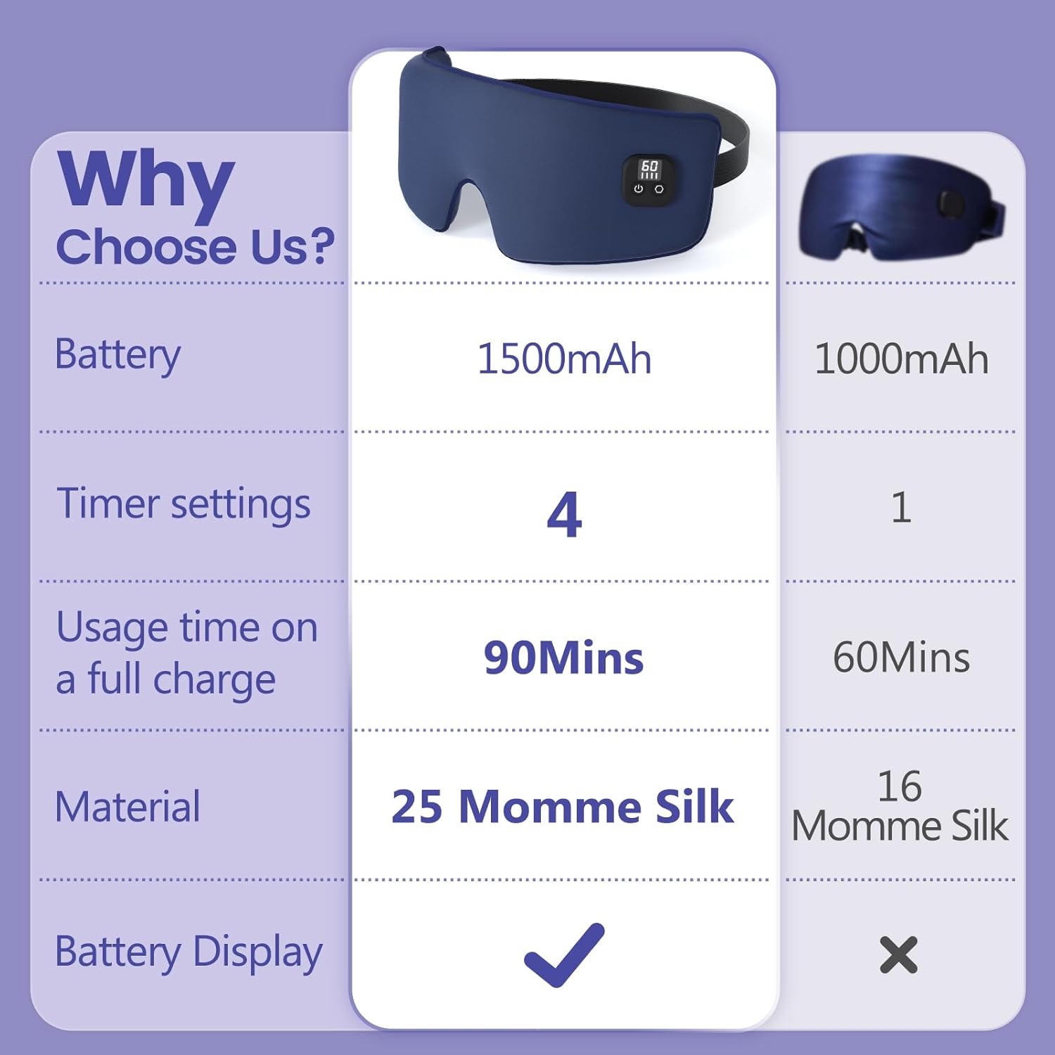 【1500mAh Large Battery】With a 2-hour charging time, the eye mask provides up to 90 minutes of continuous use on a single charge.
