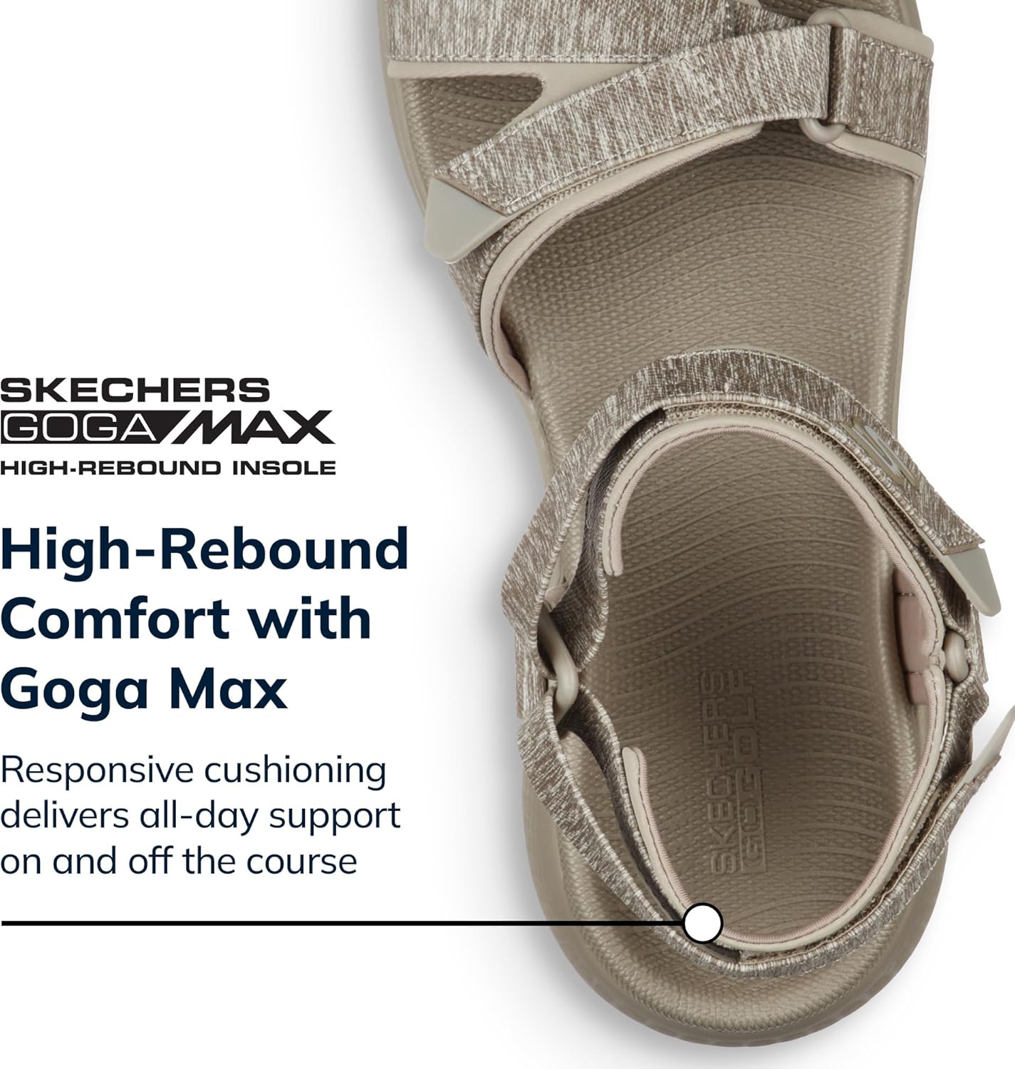 Elevate your golf game with these innovative GO GOLF 600 athletic sandals. Perfect for casual rounds, these womens sandals combine sport-ready performance with all-day comfort. Featuring a high-rebound Goga Max cushioned footbed and spikeless TPU outsole for superior stability on the course. The soft heathered jersey straps with hook and loop closures ensure a secure, customizable fit, while the 5GEN cushioning midsole provides responsive impact absorption for every step.