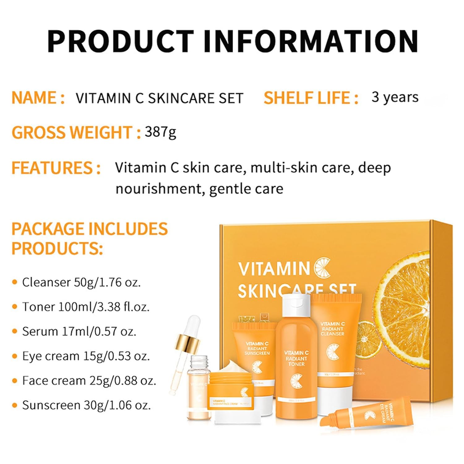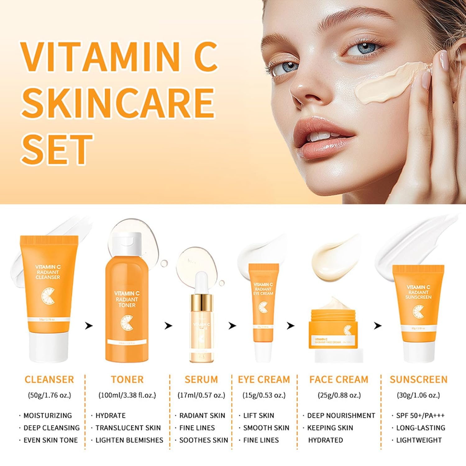 Skin Care Set, Vitamin C Facial Kit for Women, Face Skin Care Kit with Facial Cleanser, Face Serum, Face Cream, Eye Cream, Toner, Sunscreen for Hydrating Skin