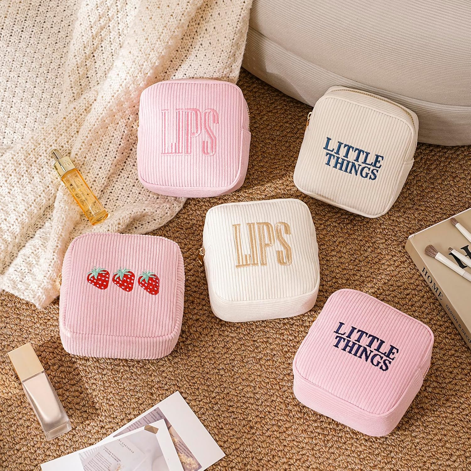 Small Corduroy Makeup Bag for Purse, Mini Aesthetic Cosmetic Pouch for Women Girls, Cute Zipper Key Pocket Lipstick Bag Card Holder Data Cable Organizer(05Beige LIPS)