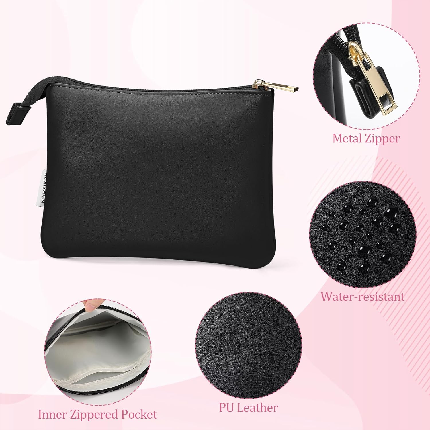 Small Makeup Bag for Purse Small Cosmetic Bag PU Leather Pouch Travel Bag with Zipper for Women (Black)