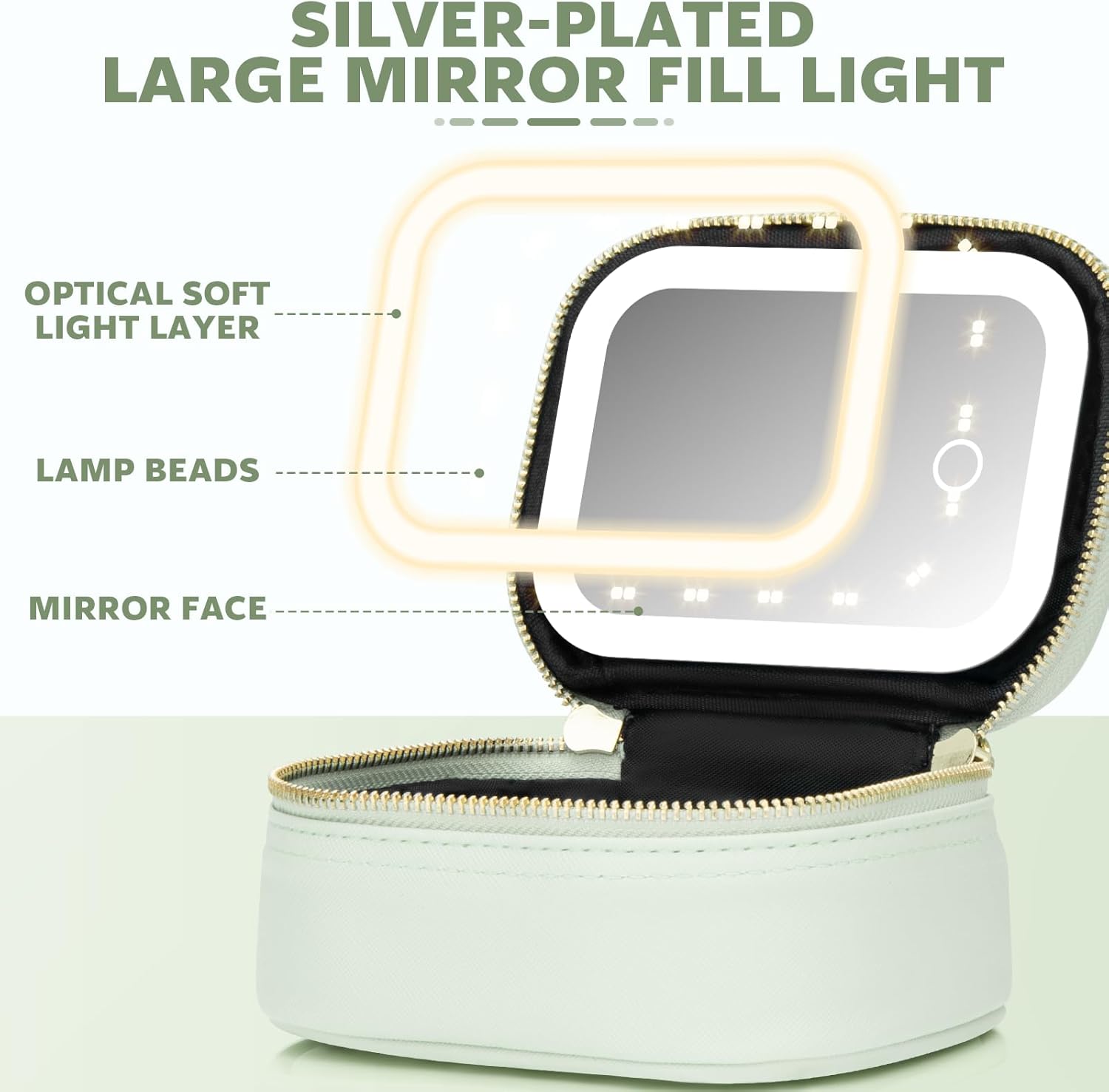 【Quality Material】The make up mirror bag is made of waterproof PU leather, easy to clean, lined with durable polyester fiber Built-in 500 mAh battery, Type-c connector for quick charging, and the mirror is also removable.