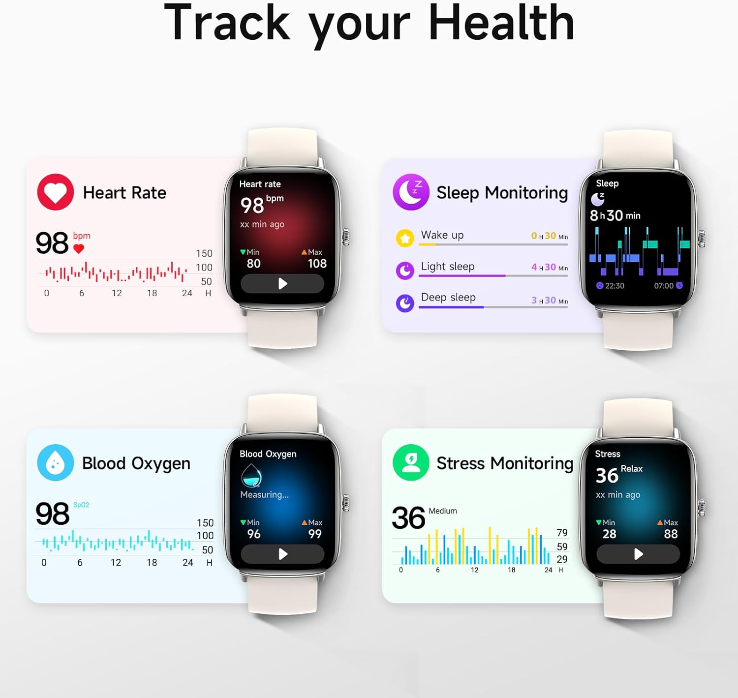 【24/7 Health Monitoring】Track your health around the clock with advanced sensors. Monitor heart rate, sleep stages, stress levels, and more, helping you make informed choices for a healthier lifestyle.