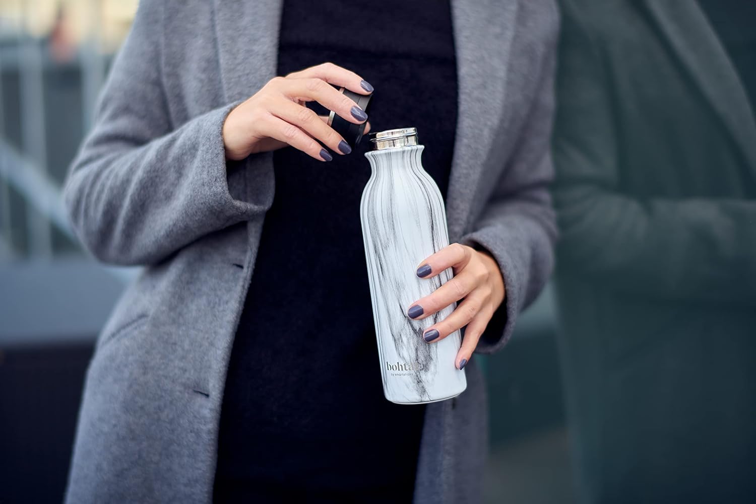 Smartshake Bohtal Double Insulated Flask Water Bottle – 600ml – 20 fl oz Stainless Steel Metal Water Bottle for Hot & Cold Drinks – BPA Free – Thermo Vacuum Metal Drinking Bottle – White Marble